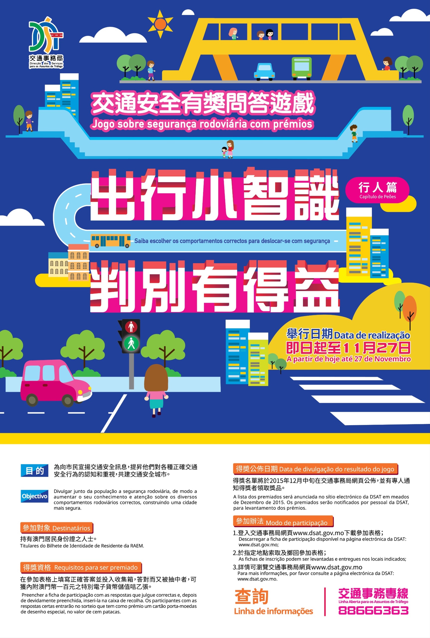 而新一期交通安全有獎問答遊戲“行人篇”即日推出,歡迎持有澳門居民身份證之人士參加,參加者只需到交通事務服務專區、永久駕駛學習暨考試中心、政府綜合服務大樓、街坊總會、工聯、婦聯、民建聯屬下部份對外服務機構索取參加表格,或登入交通事務局網站www.dsat.gov.mo下載,並於11月27日或之前填妥參加表格並交回上述地點,答對所有問題又被抽中者,可獲特別版電子貨幣儲值咭一張,每張咭內附澳門幣一百元之儲值額,每名參加者只可遞交一次參加表格,重複報名主辦單位將自行刪除其參加資格。