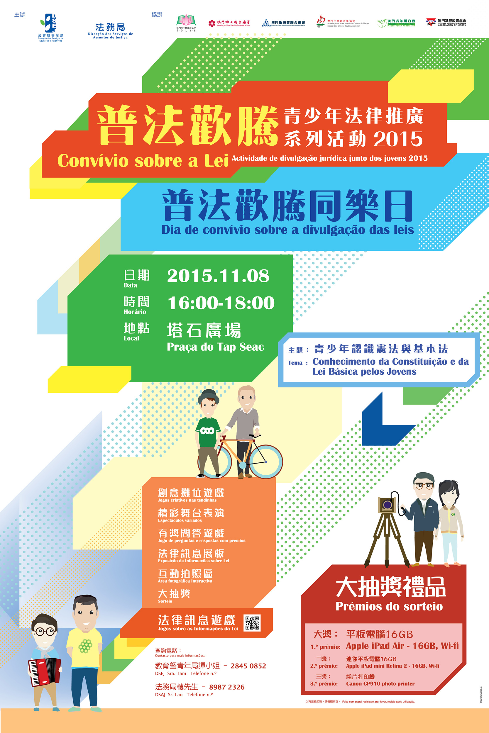 為提高青少年對國家憲法與基本法的認識,法務局及教育暨青年局將於明天(十一月八日)下午四時至六時在塔石廣場舉辦“普法歡騰同樂日”園遊會,該活動為“普法歡騰 ── 青少年法律推廣系列活動”的其中一個項目,協辦單位還有澳門基本法推廣協會、澳門婦女聯合總會、澳門街坊會聯合總會、澳門中華新青年協會、澳門青年聯合會及澳門基督教青年會。