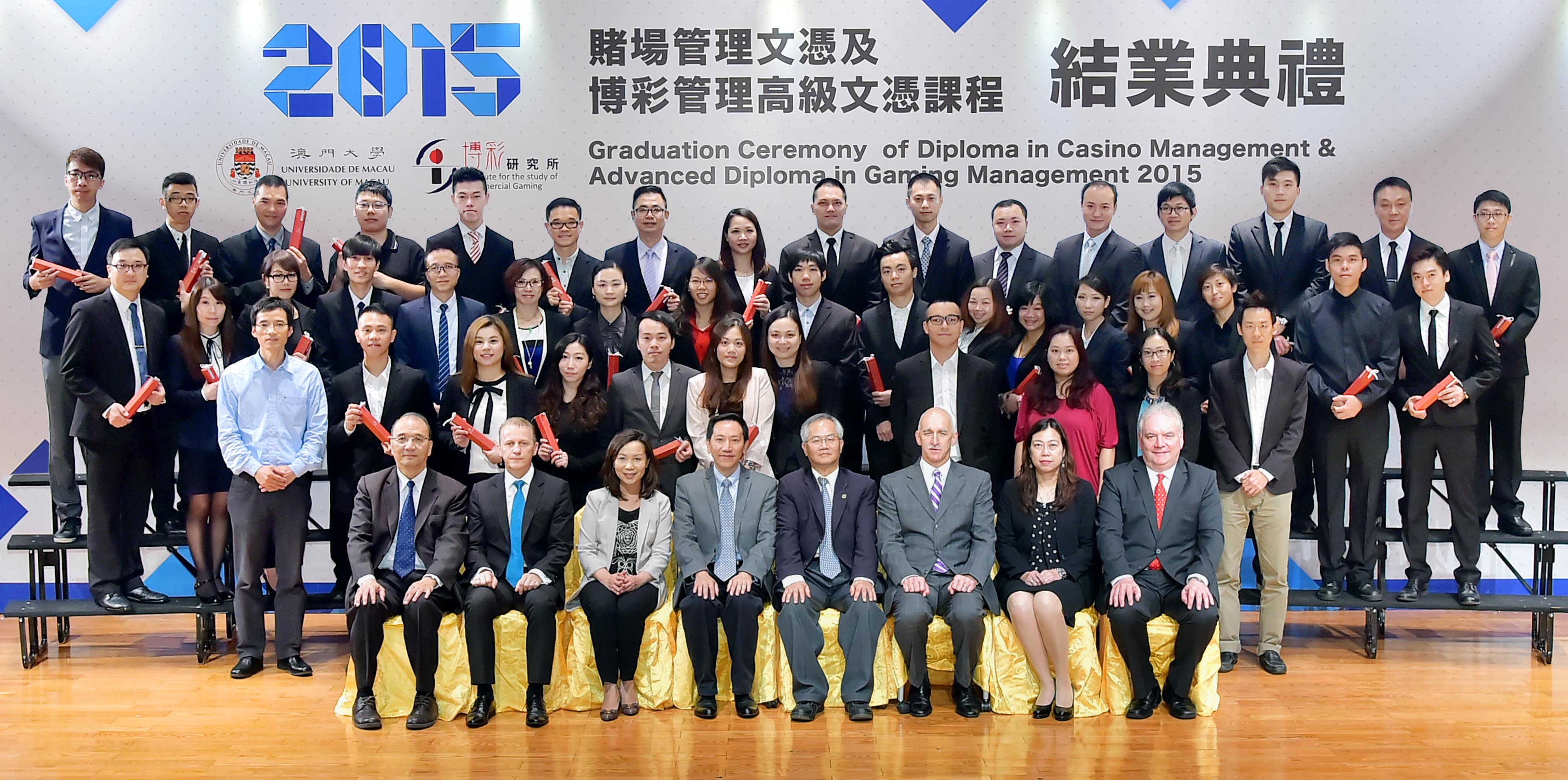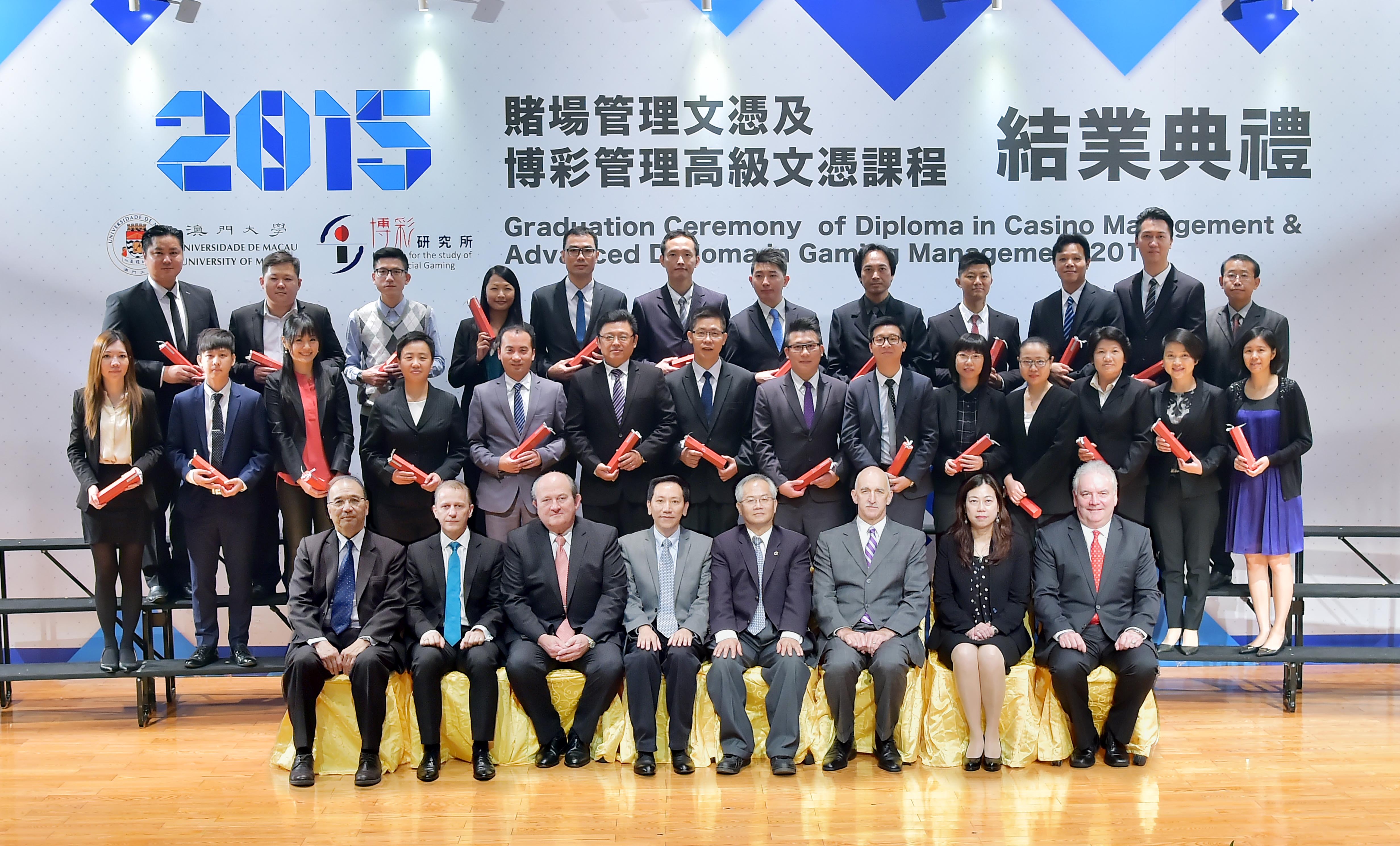澳大工商管理學院院長蘇育洲、博彩研究所所長馮家超及6大博彩營運商管理層代表主禮,向第9屆“賭場管理文憑"課程及第5屆“博彩管理高級文憑"課程近百名畢業生頒授文憑,當中有8位獲成績卓越獎及優異獎。