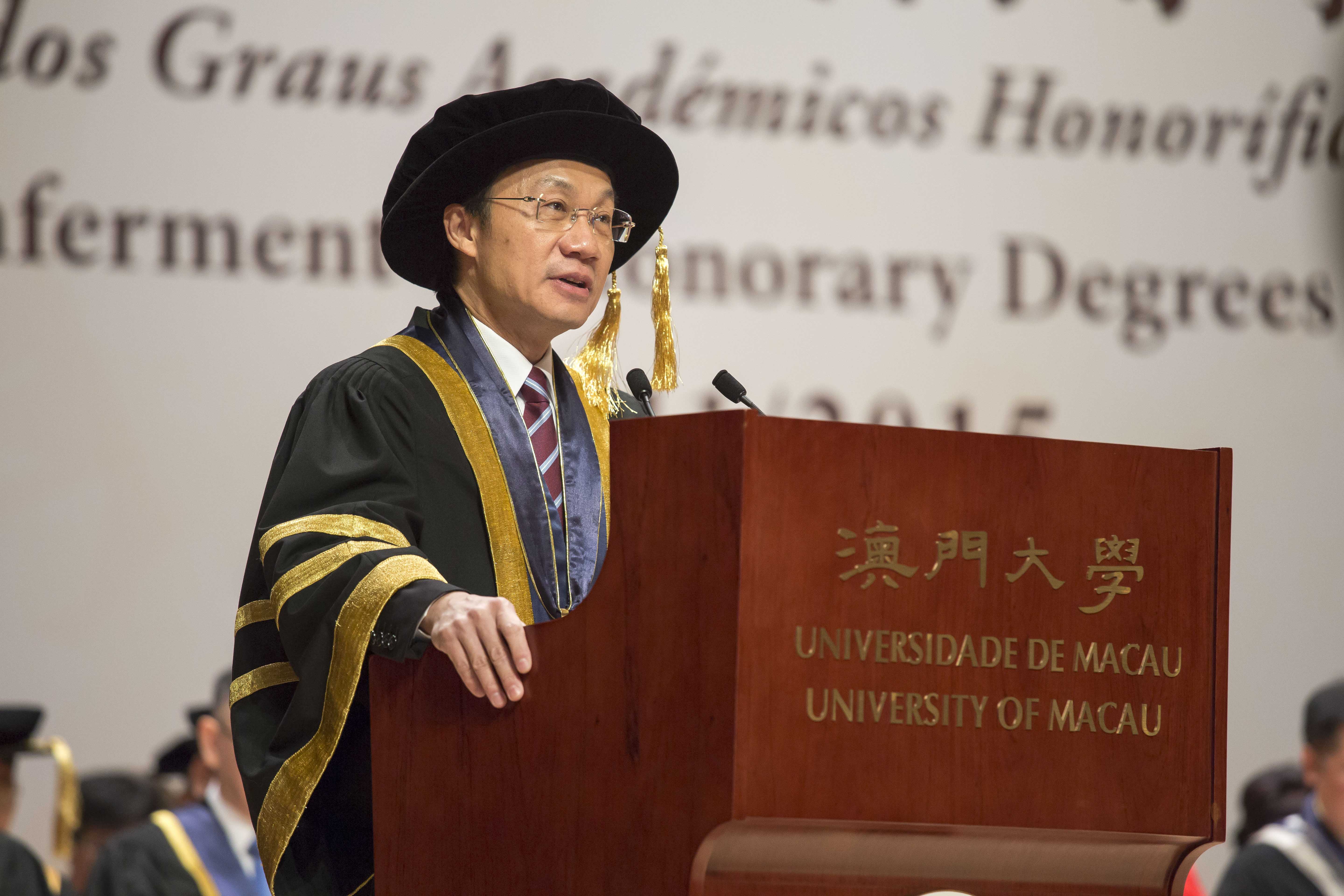 澳大校監代表、澳門特區社會文化司司長譚俊榮博士致辭時表示,希望畢業生珍惜在研究生階段的學習和研究經驗,以優異的成績回報家庭、學校和社會的培養和支持,做一個於社會有用的人,實現自身的人生價值和社會價值。