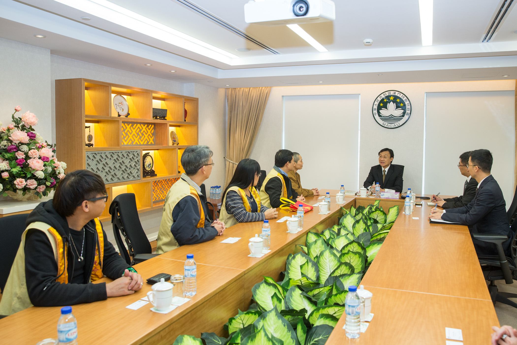 社會文化司司長譚俊榮今(14)日在特區政府總部會見澳門佛光協會輔導法師釋覺仁、會長陳志強、副會長鄧樂明等一行,雙方就加強向民衆弘揚善念,促進社會和諧的話題作交流。