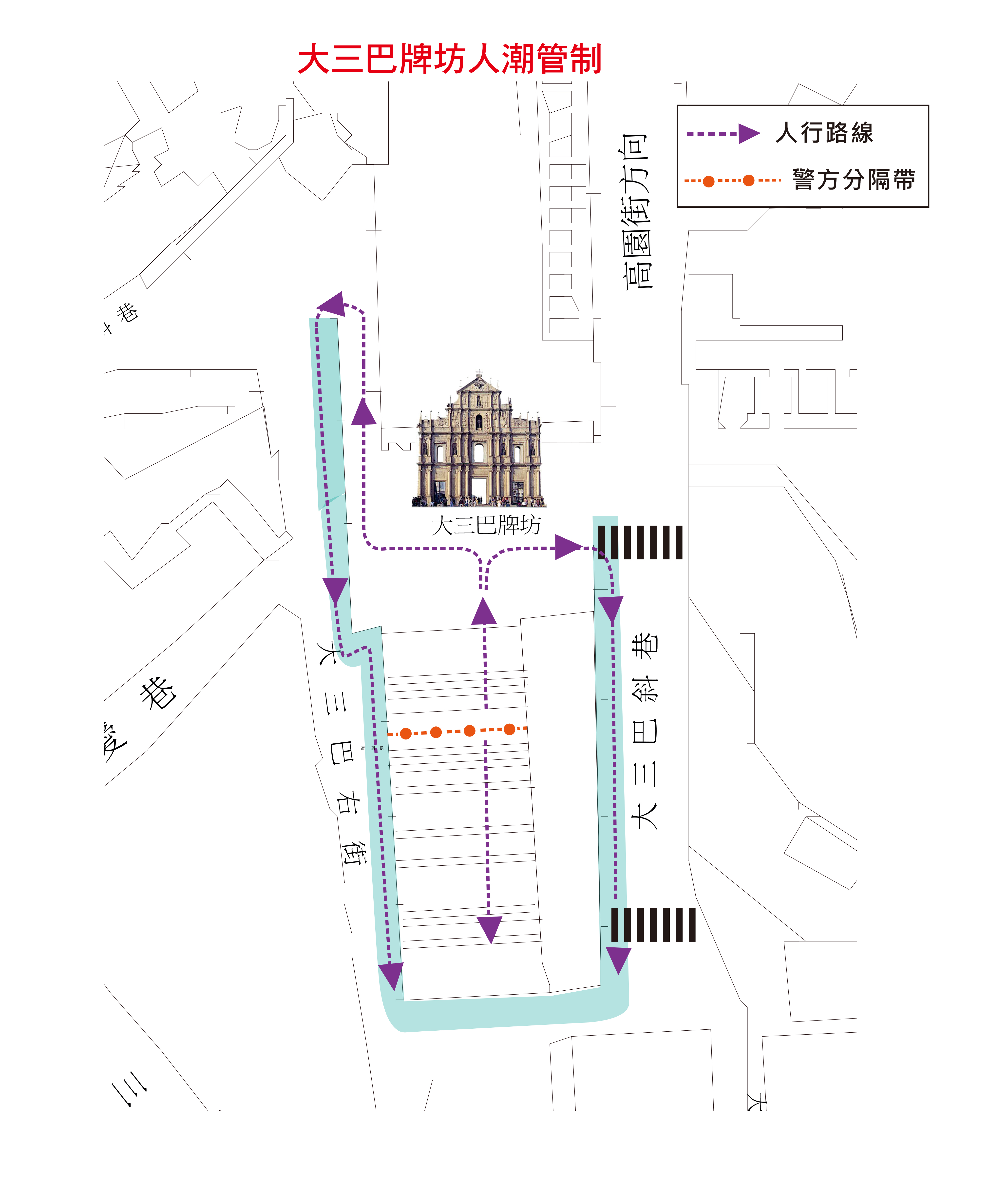 大三巴街(手信街)至牌坊一段採取人車分流措施,實行潮水式放行,並將實施單向人潮管制措施,人流只可單向上行往牌坊,並取道周邊的街巷如大關斜巷、關前後街、高園街等離開。