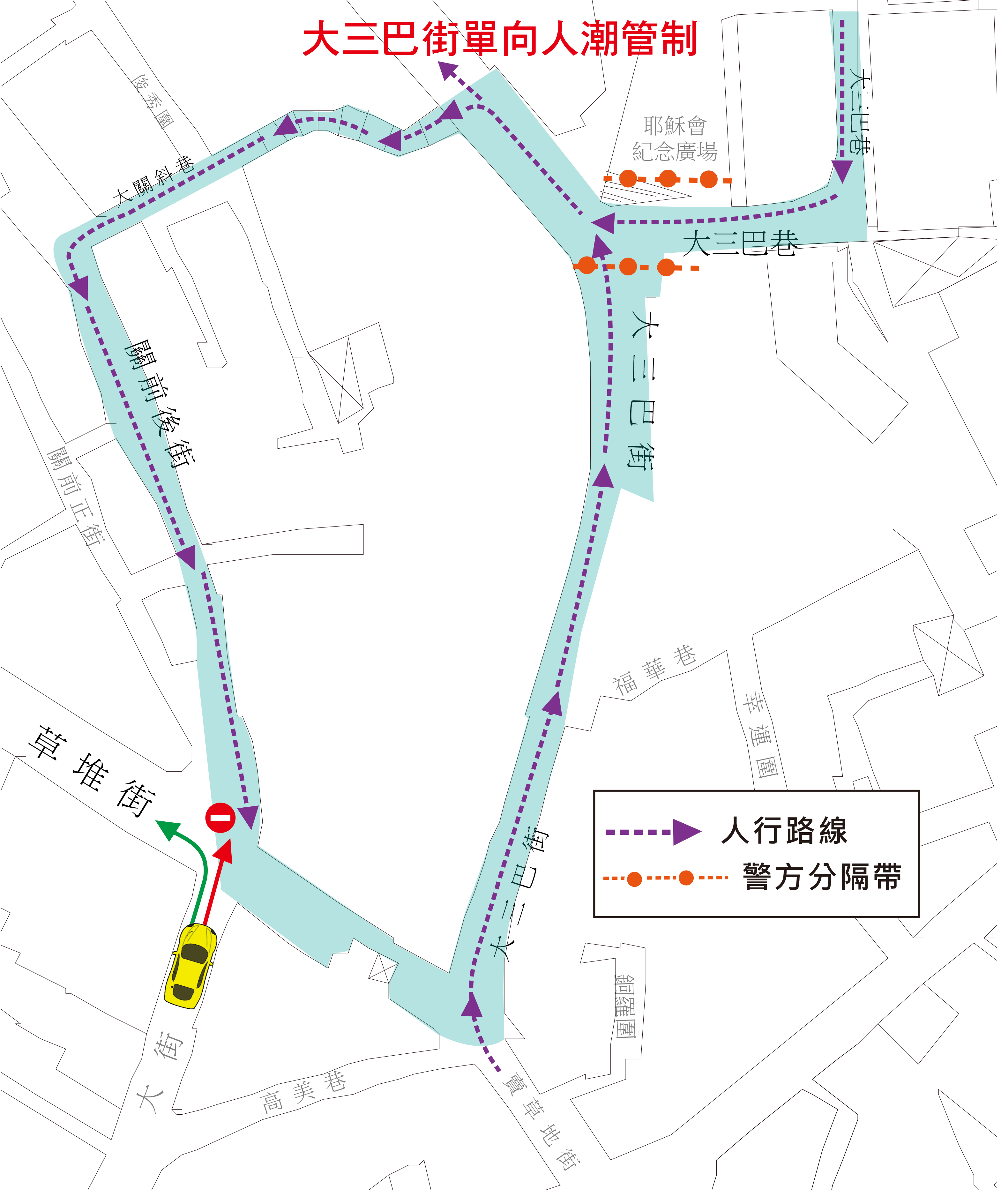 實施大三巴街單向人潮管制措施後,沿營地大街駛進之車輛需左轉草堆街方向,不可進入關前後街,以避免人車交滙而造成危險。另外,若大三巴一帶出現持續擠擁的人潮,沿高園街駛進之車輛需右轉同安街離去,以及禁止旅遊巴駛上西墳馬路,直至人潮情況舒緩。