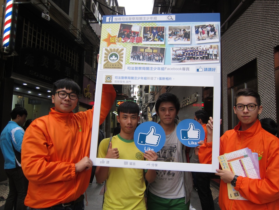 司警局更特別製作了臉書(Facebook)道具,由 “滅罪小先鋒” 學員邀請青少年與他們合照,期後將相片上載至關注少年組臉書專頁,獲邀拍照者在關注該專頁後即可為相片進行標註。青少年反應熱烈,活動現場洋溢活力和歡樂。