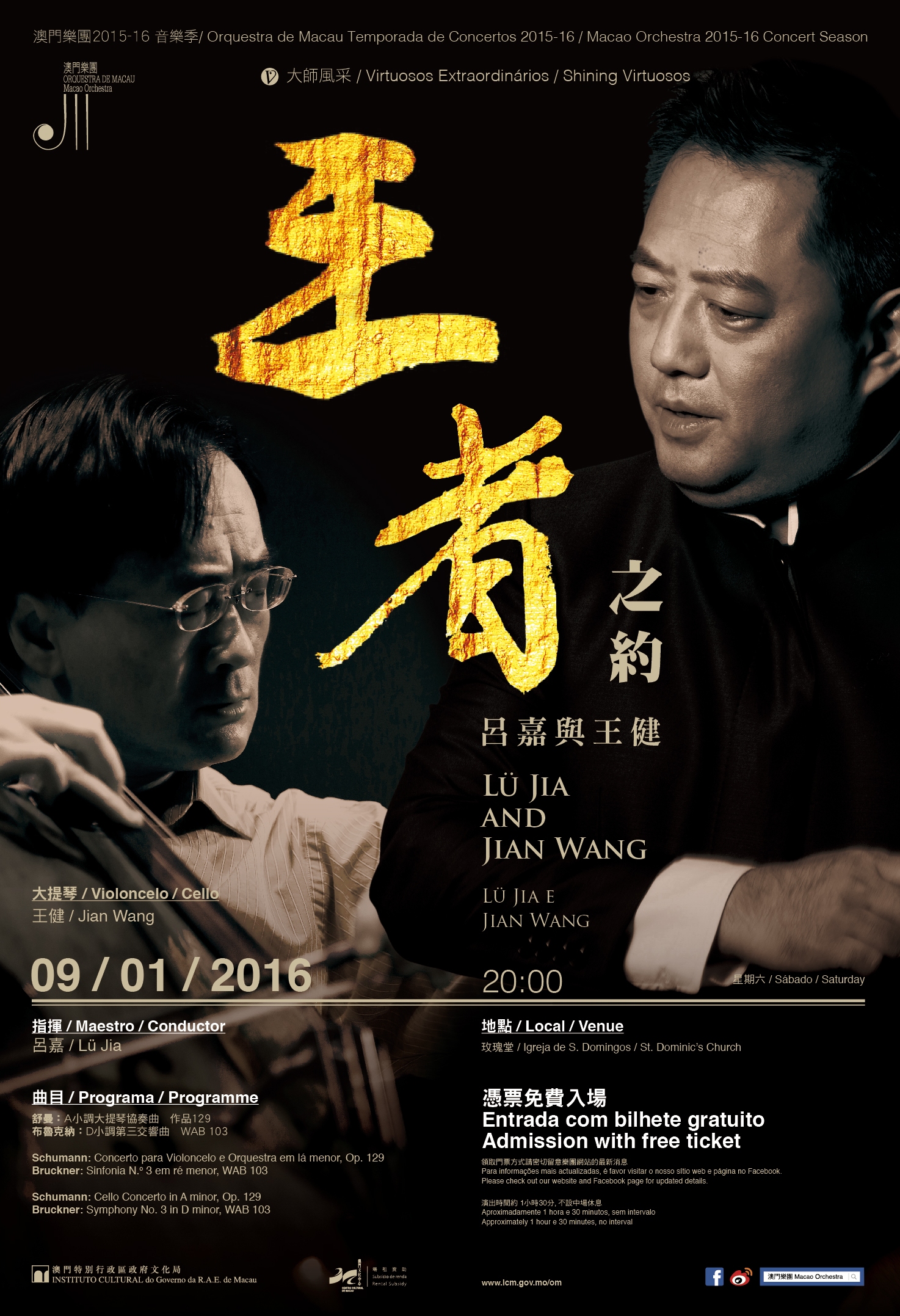 文化局澳門樂團邀請享負盛名的國際大提琴家王健,與音樂總監兼首席指揮呂嘉攜手,於一月九日(星期六)晚上八時在玫瑰堂呈獻《王者之約──呂嘉與王健》音樂會,入場劵將於當日演出前一小時,在玫瑰堂正門口派發,歡迎市民前往欣賞。
