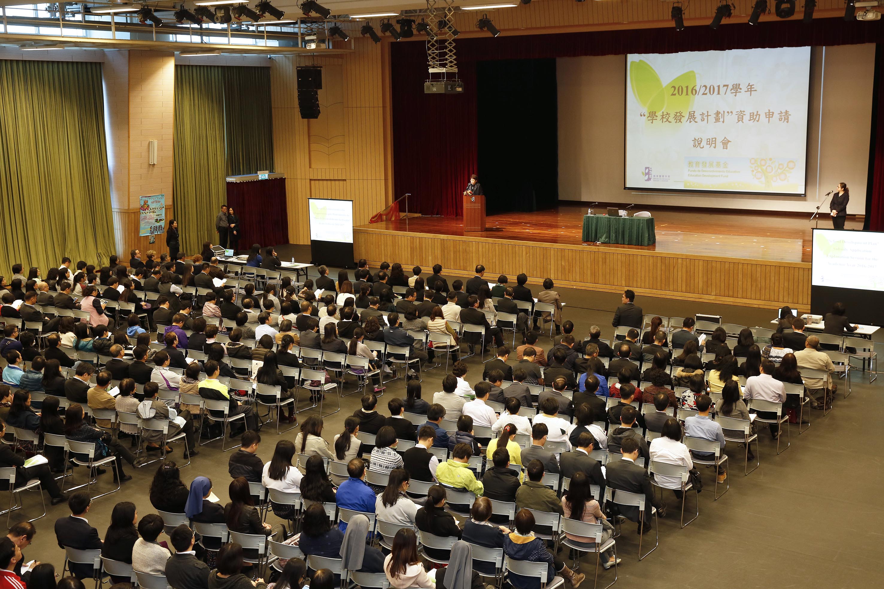 教育發展基金於2016年1月7日下午假教業中學禮堂舉辦了“2016/2017學年學校發展計劃”說明會。教育發展基金主席及委員、教育暨青年局領導及主管,以及77所學校領導及相關人員共400多人出席了會議。