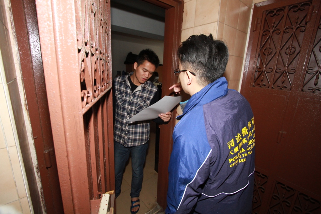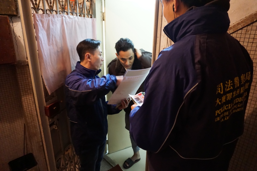 農曆新年將至,為遏止新春期間發生的犯罪活動,司法警察局執行由警察總局統籌的冬防行動,自1月底開始持續於本澳各區進行防罪巡查,並於今日(2月3日)派出警力22人到工業大廈及勞工宿舍進行防罪宣傳,提醒工廈管理人員及外地僱員及早做好防範,以預防盜竊、詐騙及搶劫等罪案的發生。