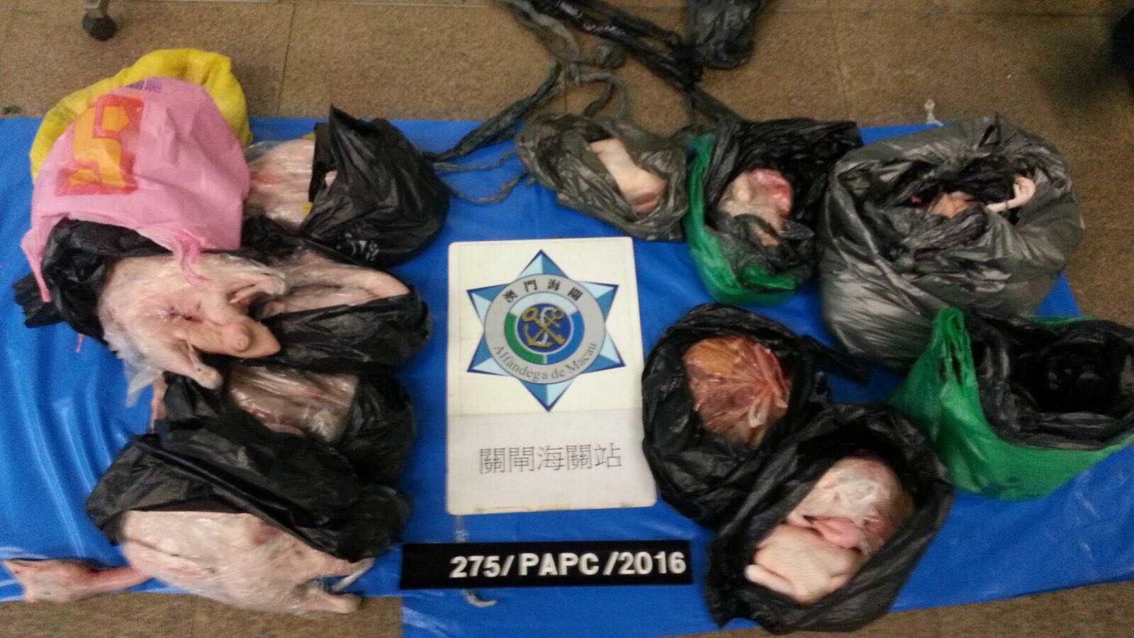昨午(4日)四時左右,海關在加強堵截未經衛檢生鮮食材行動期間,關員在關閘入境旅客通道檢查一名從珠海回澳的56歲女性居民後,發現其隨身物品內藏有已屠宰家禽及其內臟,共36公斤,分別有17公斤有已宰光雞、4公斤雞內臟和15公斤已宰鮮鵝。海關已依法起訴涉案女子,並將未經衛生檢疫的食材交民政總署處理。