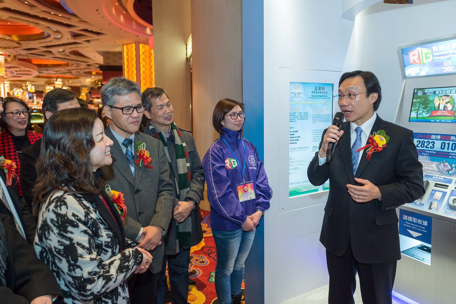 啟動禮首先由澳門大學博彩研究所馮家超所長簡介資訊站的構思與功能,隨後譚俊榮司長在2名「負責任博彩推廣大使」的帶引下,參觀了「負責任博彩資訊站」,並嘗試使用設備撥打24小時賭博輔導熱線,譚司長讚揚熱線社工人員專業,能夠幫助受賭博問題困擾人士。