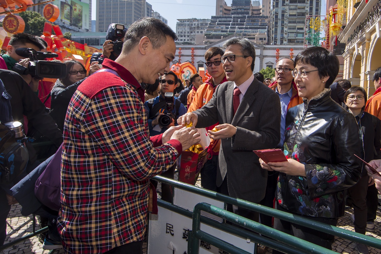 社會文化司司長辦公室主任葉炳權、旅遊局局長文綺華、文化局局長吳衛鳴、民政總署管理委員會委員關施敏、旅遊局副局長謝慶茜及程衛東,以及業界代表等,於大年初一早上在大三巴牌坊廣場主持金龍和醒獅點睛儀式,又於議事亭前地燃放炮竹;之後,嘉賓們聯同財神爺在議事亭前地向市民和旅客派“利是”和金元寶,現場喜氣洋洋,祝福聲連連,尤其在財神爺手中接過“利是”,取其好意,祝願澳門繁榮興旺、財源廣進。
