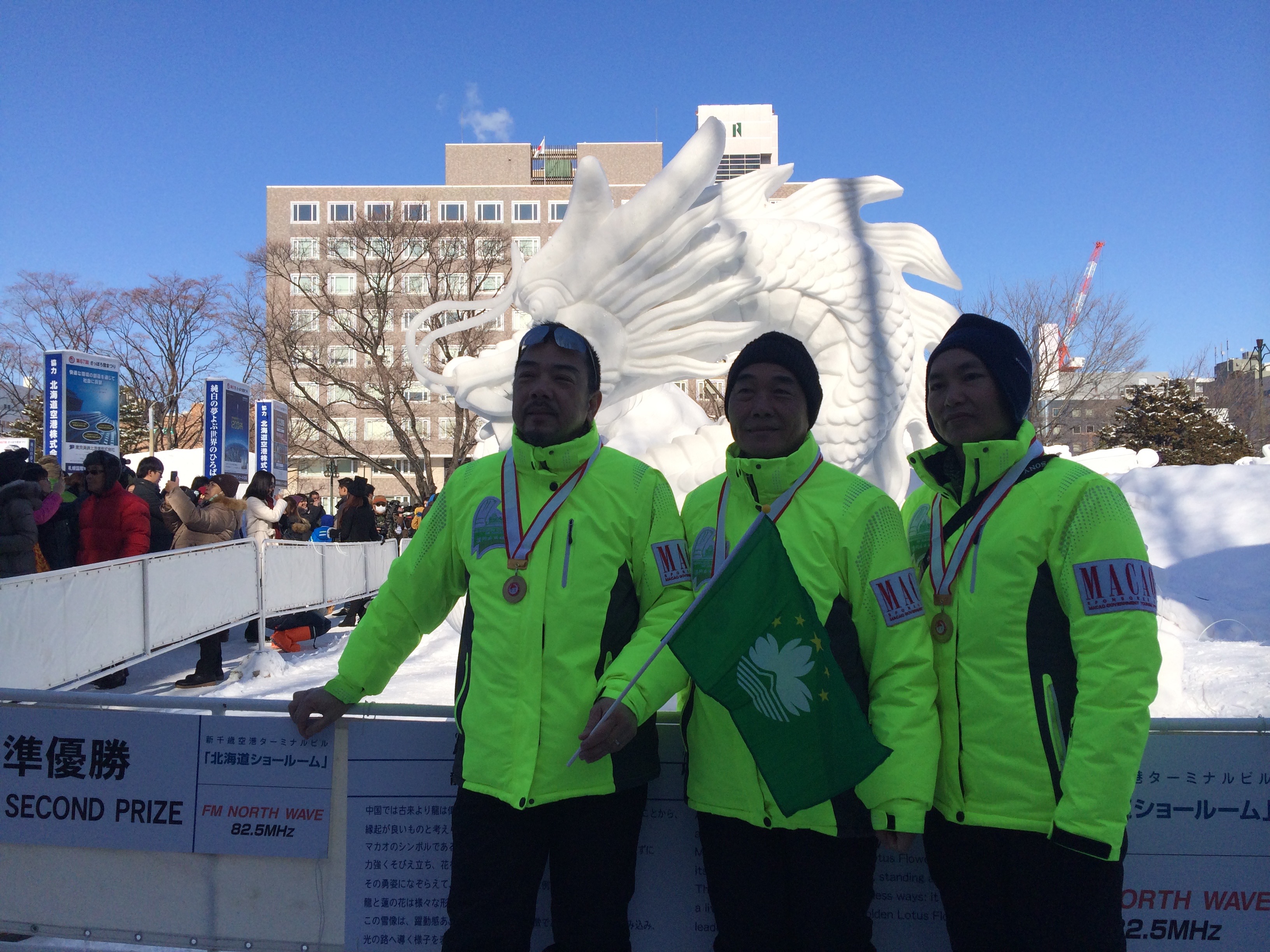 澳門隊以“龍抱金蓮”為題的雪雕參賽,各成員不畏嚴寒,經歷數個晝夜後製作出雕功精巧、栩栩如生的雪雕,並最終憑實力與耐力勇奪“第43屆國際雪雕比賽”亞軍。