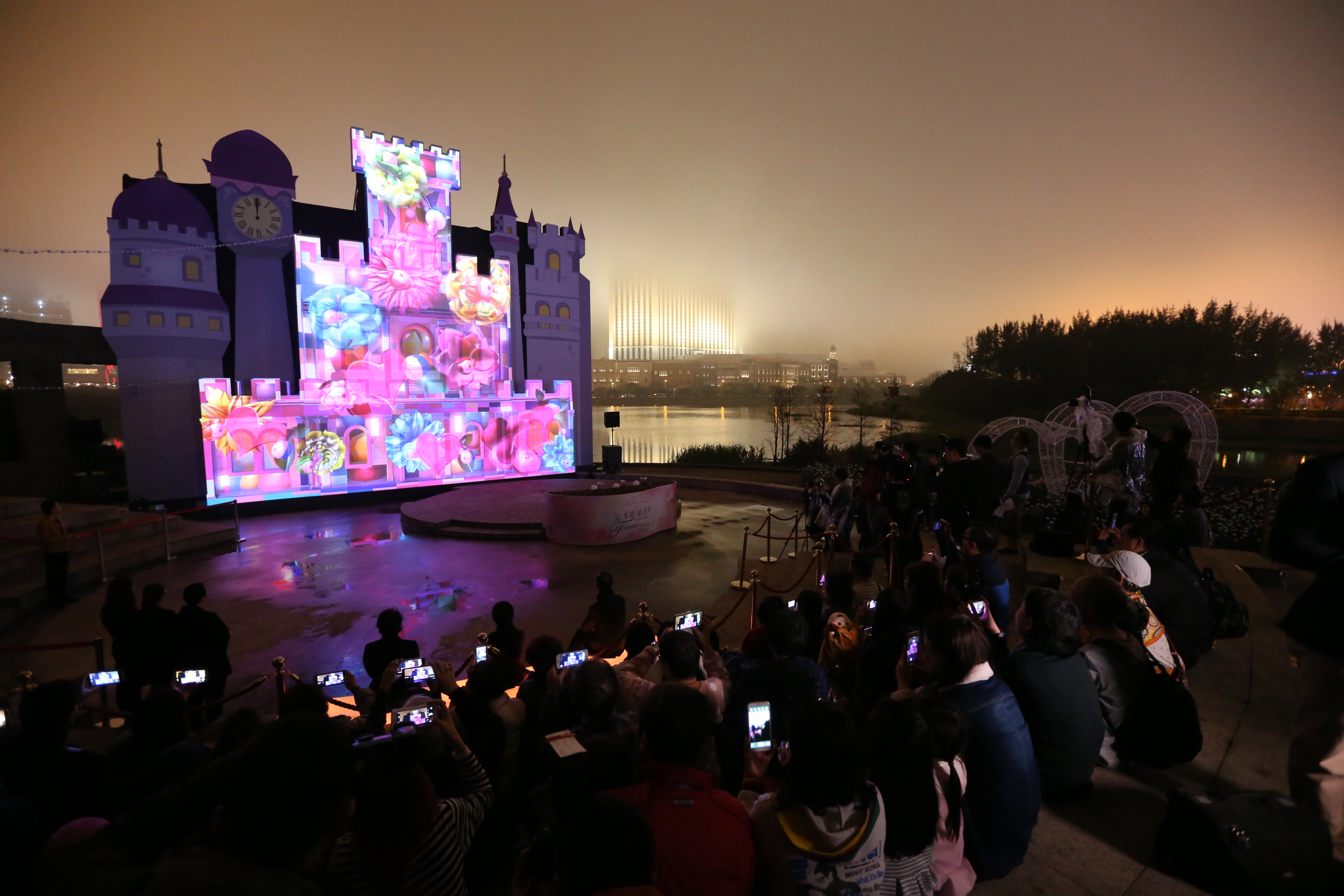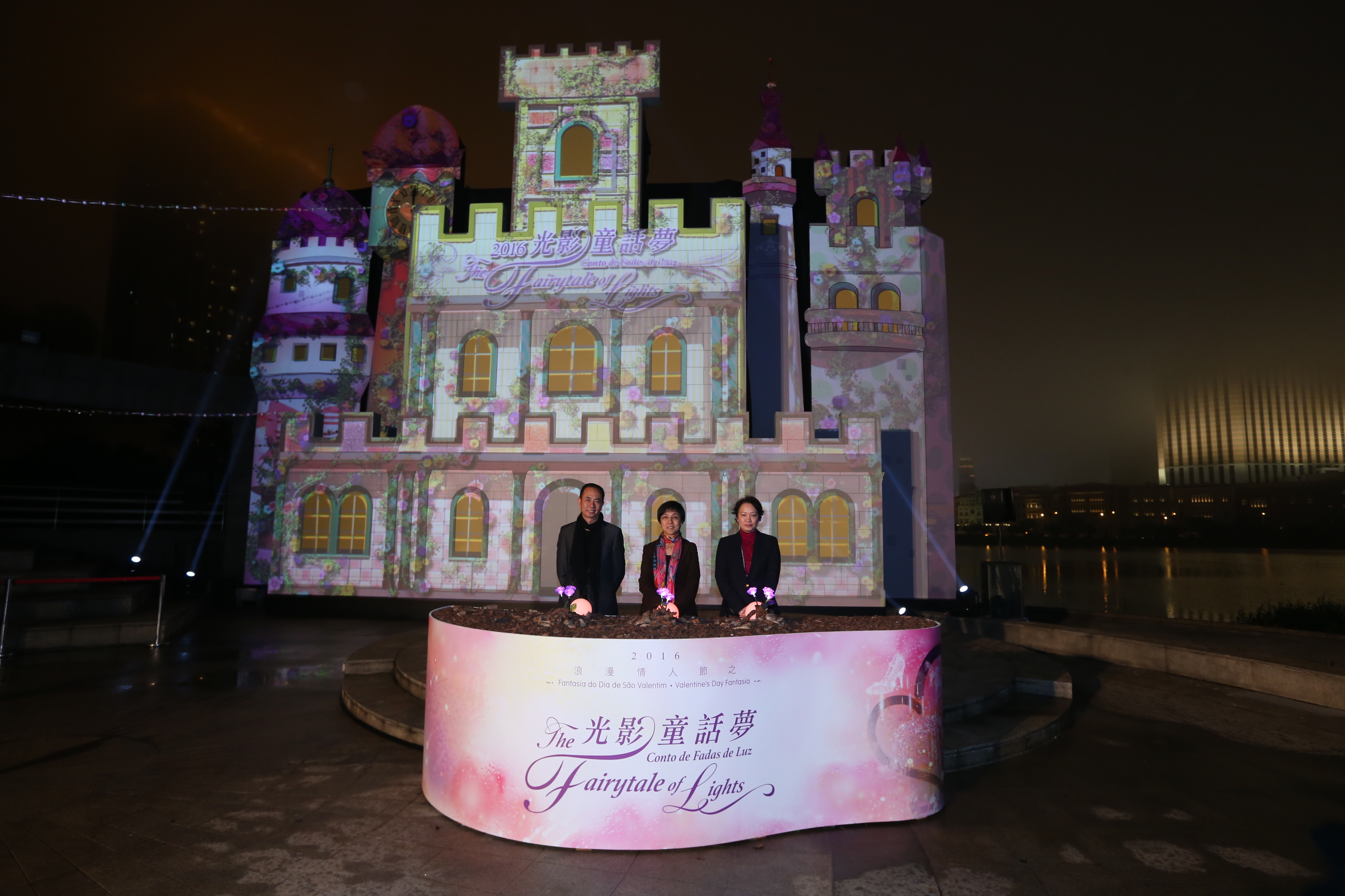 旅遊局局長文綺華、文化局局長吳衛鳴和民政總署管理委員會委員關施敏為“2016浪漫情人節之光影童話夢”的光雕表演拉開序幕,如幻似真的“灰姑娘的玻璃鞋”光雕表演隨即正式上演,帶領觀眾穿梭時空,進入浪漫童話夢。