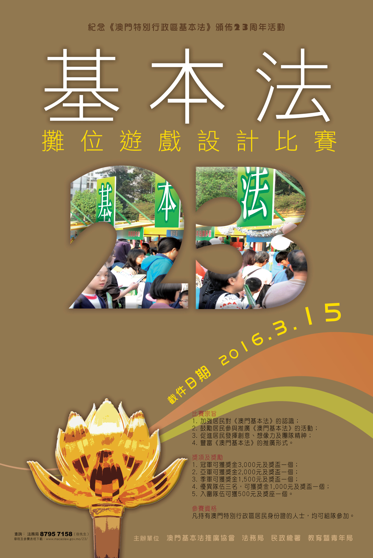 《澳門特別行政區基本法》頒佈至今快將迎來第二十三周年,為此澳門基本法推廣協會、法務局、民政總署及教育暨青年局共同舉辦一系列慶祝活動,推出基本法攤位遊戲設計比賽,結合社會力量,共同推廣《基本法》,有興趣參加的市民請把握時間從速報名。