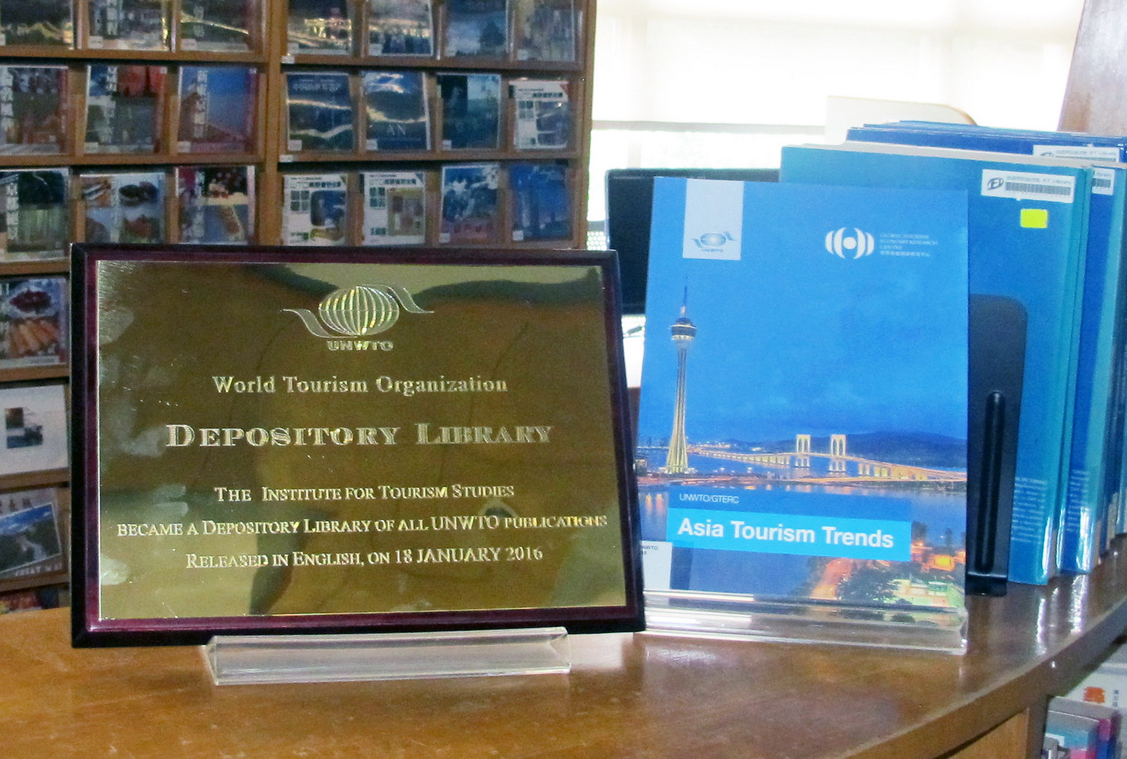 2016年1月,旅遊學院圖書館成功申請成為澳門首間聯合國世界旅遊組織(UNWTO)出版物的寄存圖書館。聯合國世界旅遊組織的寄存圖書館計劃於2003年推出,主要目的是把該組織出版的研究報告提供妥善的保存方法供讀者閱覽,直至現時為止,全球約60所圖書館已成為該組織的寄存圖書館,分佈於30個國家及地區。旅遊學院圖書館是港澳台地區首間寄存圖書館。由2016年起,學院圖書館將獲得該組織最新的官方英文出版物藏於館內供讀者參閱,為澳門乃至鄰近地區提供更豐富及完善的旅遊資訊,有助支援澳門及鄰近地區的旅遊業科研項目。