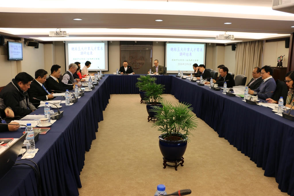 人才發展委員會下設規劃評估專責小組日前召開2016年度第一次小組會議,由小組召集人楊俊文博士主持。是次會議上,委員會就早前為配合世界旅遊休閒中心的建設所進行的包括酒店、餐飲、會展、博彩和零售五行業調研,所得出的人才需求數據及其後續工作進行了討論。