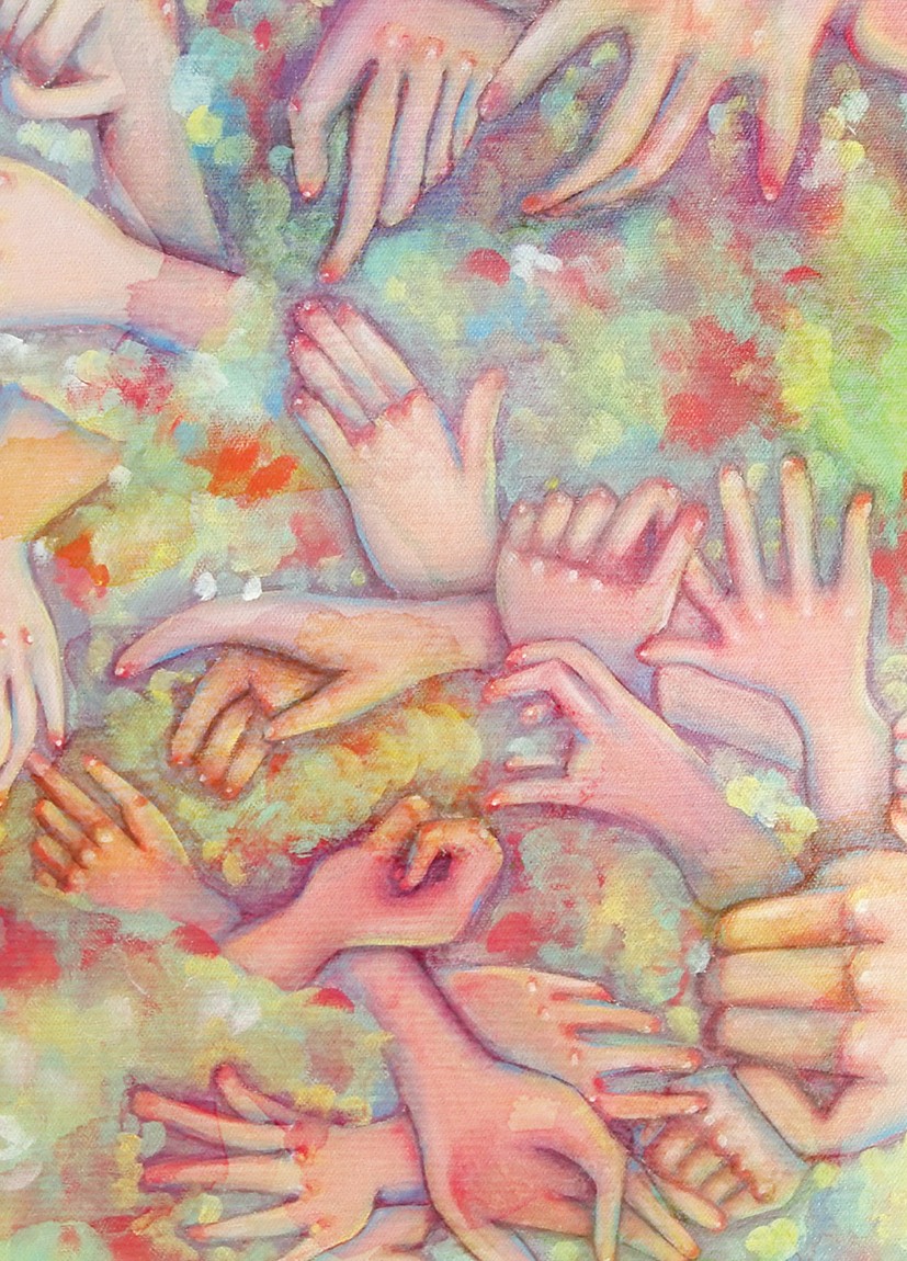 植說認為社會就像一個蜘蛛網,有著各種形式的規則與制度,網中人們擁有各自邏輯理論及無形方式,潛意識下擁護自己那一套及自身認為對的事情。是次作品融合手型的雕塑與插畫作串聯,其中插畫部份以手組成,展現出柔弱的動物被纏繞與包裹,帶有諷刺意味,營造被保護卻也被束縛的互動形式,藉此思考人與人及人與動物之間的微妙關係。