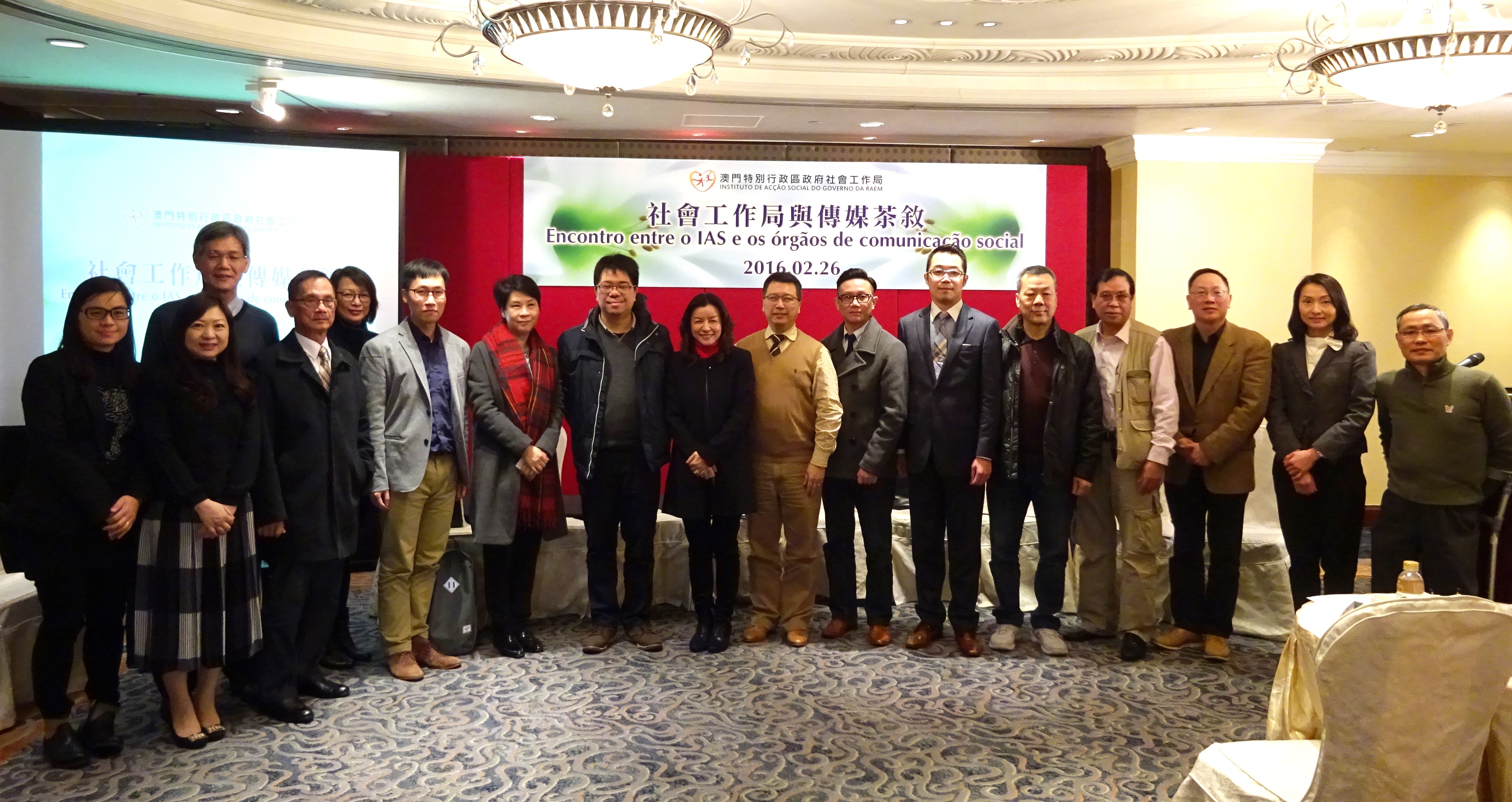 社會工作局今(26日)下午假皇都酒店舉辦傳媒茶敍。社工局局長黃艷梅、副局長韓衛和區志強,帶領轄下6位廳長及多名處長與新聞界會面,介紹新組織架構內容及本年度的工作重點,雙方就關注的議題交流意見。 出席茶敍的傳媒機構有澳門日報、華僑報、市民日報、濠江日報、星報、正報、現代澳門日報、新華澳報、力報、訊報、澳門時報、澳門商報、澳門會展經濟報、體育週報、澳門文娛報、節慶盛事報、澳門焦點報、正思今日澳門、澳廣視和澳門電台(中葡頻道)、澳亞衛視、蓮花衛視、人民日報澳門分社、國家新聞出版廣電總局、香港文匯報、澳門論壇日報 (Jornal Tribuna de Macau)、號角報(Clarim/Semanário)、今日澳門(Hoje Macau)、澳門郵報(Macau Post)、葡萄牙新聞社駐澳門代表處(Agência Lusa)40多名本澳各大傳媒機構總裁、社長、採編主管或代表以及記者朋友,獲社工局領導及主管熱情接待。 社工局局長黃艷梅致辭表時感謝新聞界對社會服務工作的支援和關注,她強調社工局秉承“助民解困,共建新生”的服務宗旨,貫徹特區政府“以人為本,科學決策”的施政理念,致力完善各項與居民生活息息相關的民生事務。因此,有賴新聞媒體以不同形式的報道,讓市民大眾從不同角度瞭解服務,同時反映了市民的需要和意見,充份發揮輿論監督的作用。她期望加強與新聞界合作,提升政務公開的施政效能,促進社會和諧進步,共建幸福家園。 會上,引介第28/2015號行政法規《社會工作局的組織及運作》,向傳媒介紹各部門的職能及服務性質,以及2016年社工局的重點工作計劃,期間,與會人士積極發言,雙方對關注的議題包括有:防治問題賭博服務及自我隔離措施、非本地居民服務、家事調解服務、長者服務、托兒服務、社工註冊制度、社工局新組織架構等作互動交流,內容充實,有助增進社工局與傳媒之間友好溝通和合作關係。