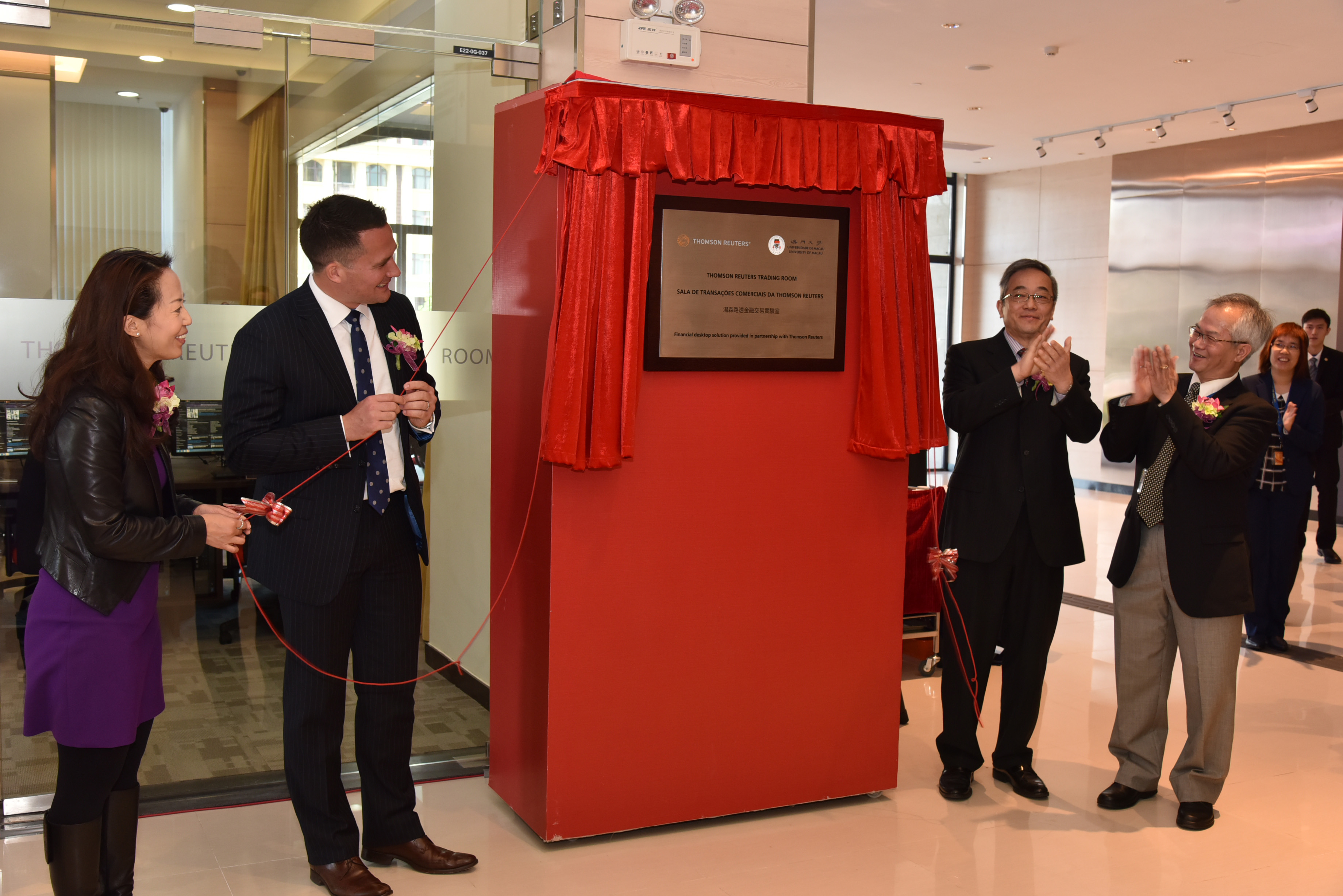 澳大副校長(學生事務)程海東教授、工商管理學院院長蘇育洲,湯森路透北亞區財務風險業務總裁James Mirfin及港澳區銷售總監陸慧敏為交易室開盤。程海東致辭時表示,隨着實驗室數量增多,澳大學者的科研能力得以大大提升,同時為學生建設更完善學習環境。程副校長感謝湯森路透集團長期支持澳大發展,他深信湯森路透金融交易實驗室定能為學生提供世界一流的摸擬交易環境,使學生更貼近金融市場實況,獲得寶貴的實踐經驗。