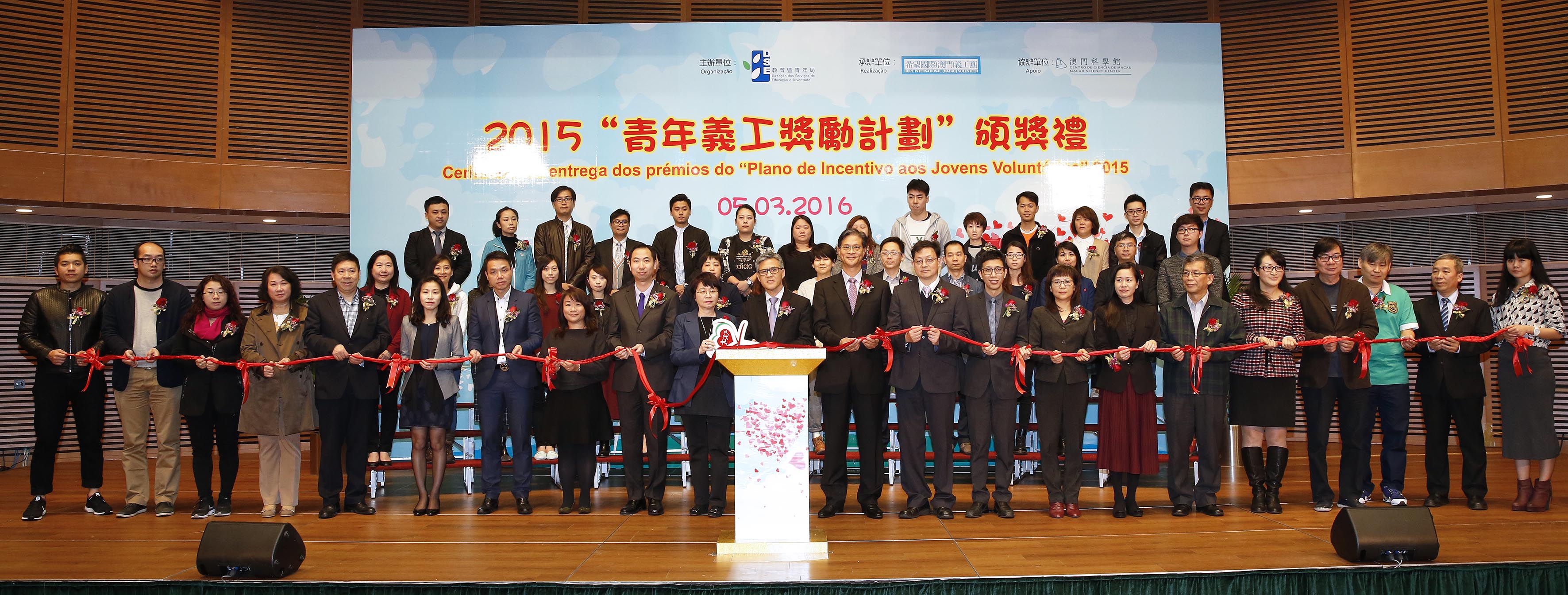 由教育暨青年局主辦、希望國際(澳門)義工團承辦、澳門科學館股份有限公司協辦的2015“青年義工獎勵計劃"頒獎禮於2016年3月5日(星期六)假澳門科學館舉行。舉辦“青年義工獎勵計劃"頒獎禮目的是為表揚及肯定青年義工對社會的貢獻,進一步推動青年義工持續積極參與和推動義務工作,並鼓勵社會各界和青年加入義工行列,發揮助人自助的精神,共同為澳門社會注入正能量;同時,為了加強計劃在社會上的影響力、廣開參與義務工作的途徑,並向青年發放更多正面的訊息,主辦單位亦於場外設立攤位進行推廣活動,約350人出席。