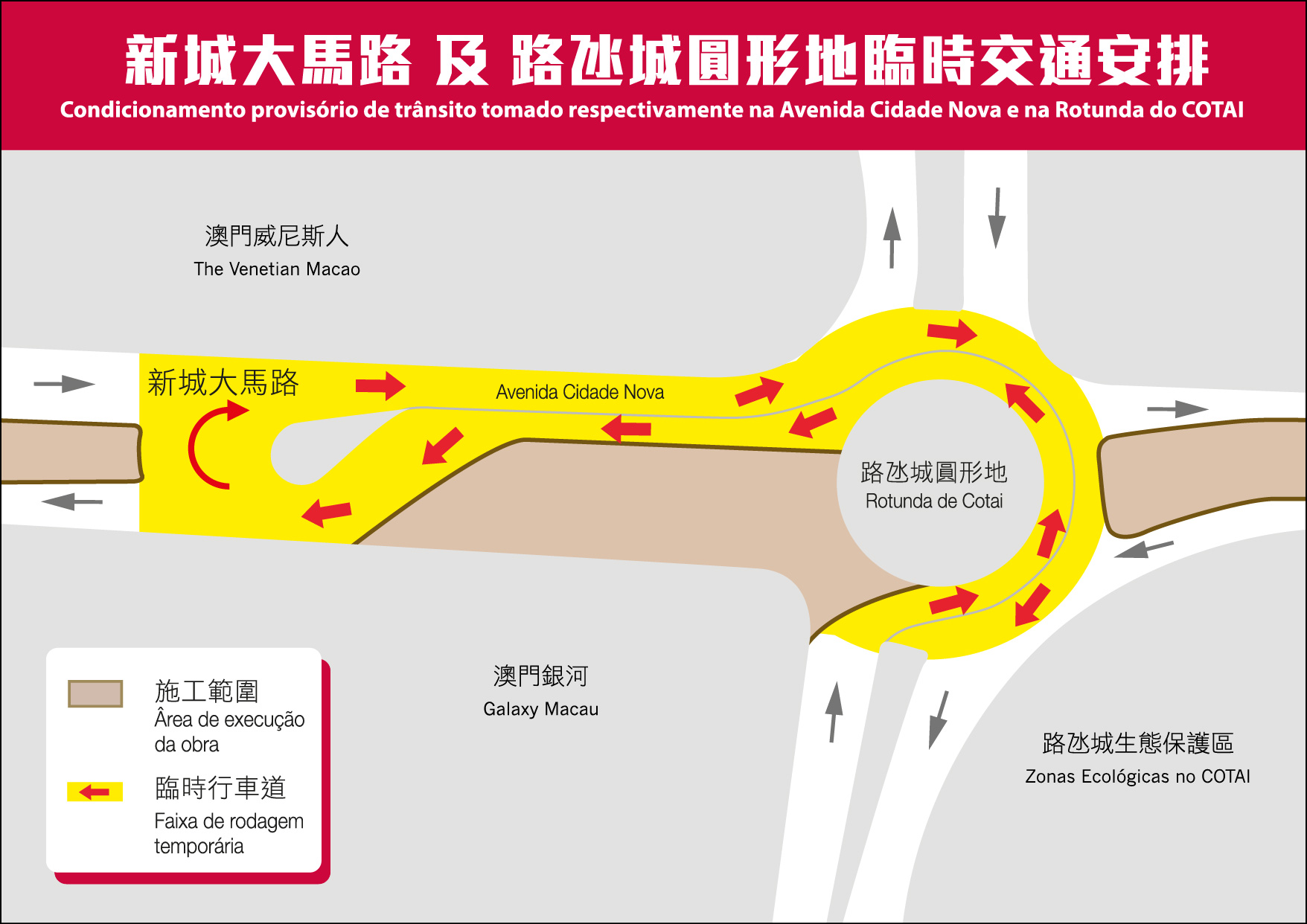 配合輕軌工程吊裝高架橋施工,本周日(20日)上午9時至晚上8時,靠近路氹城圓形地的一段新城大馬路(靠近澳門銀河一側)將實施臨時封閉,禁止車輛通行。施工期間,路氹城圓形地以及靠近威尼斯人一側的新城大馬路將臨時改為雙向單線行車,以維持該處行車方向。