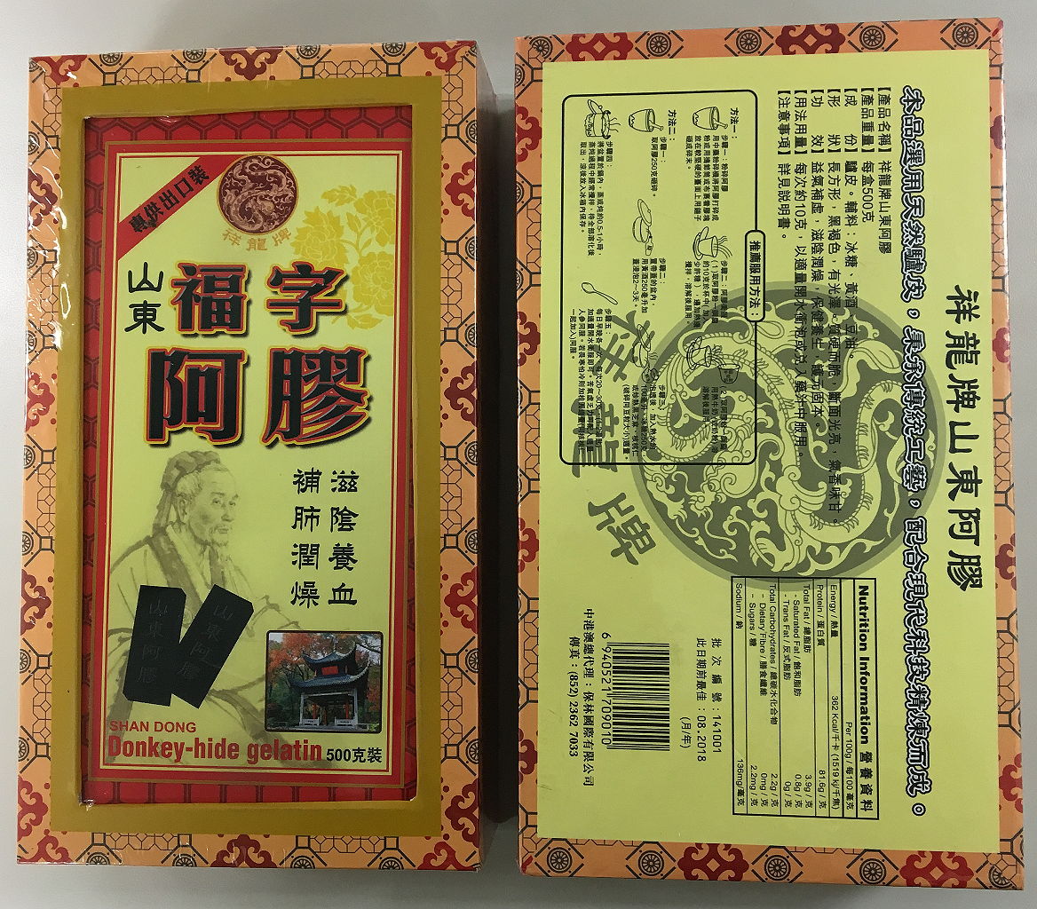 衛生局對澳門市場上的中藥材作例行抽檢,發現下列批次的中藥材“阿膠”摻有牛皮源成分(詳見附表),衛生局已對該等問題產品封存。“阿膠”是由驢皮煎煮濃縮製成的產品,屬於澳門特區所用中藥材表第II部份的普通中藥材,功效為補血滋陰、潤燥、止血。根據國家相關標準的規定,“阿膠”不能摻有驢皮以外的動物成分,為保障公眾健康,衛生局已要求中藥房及有關的藥物出入口商回收上述問題批次的“阿膠”,並呼籲巿民停止使用該等批次的產品。此外,衛生局繼續對市面上的“阿膠”進行抽檢。