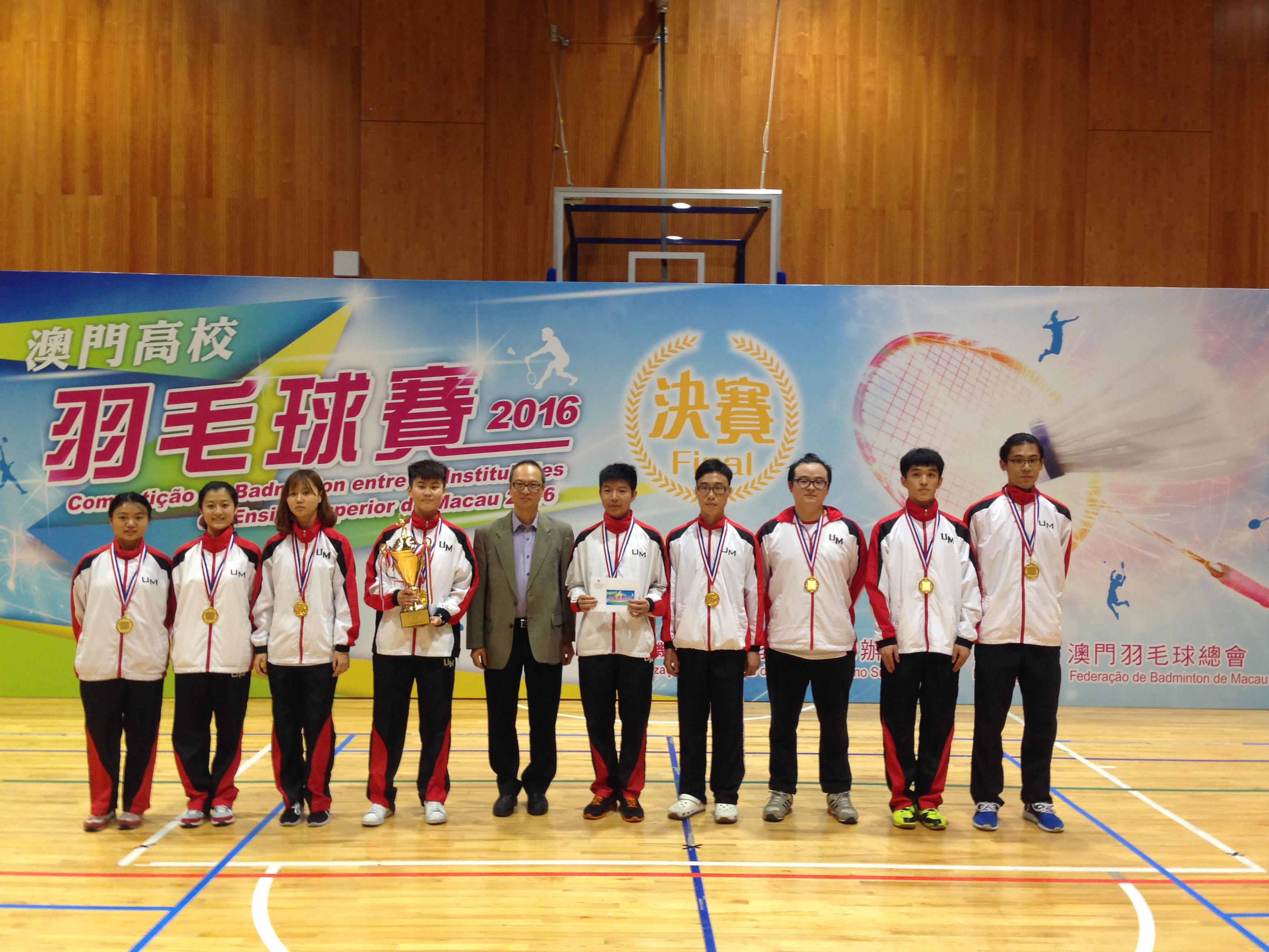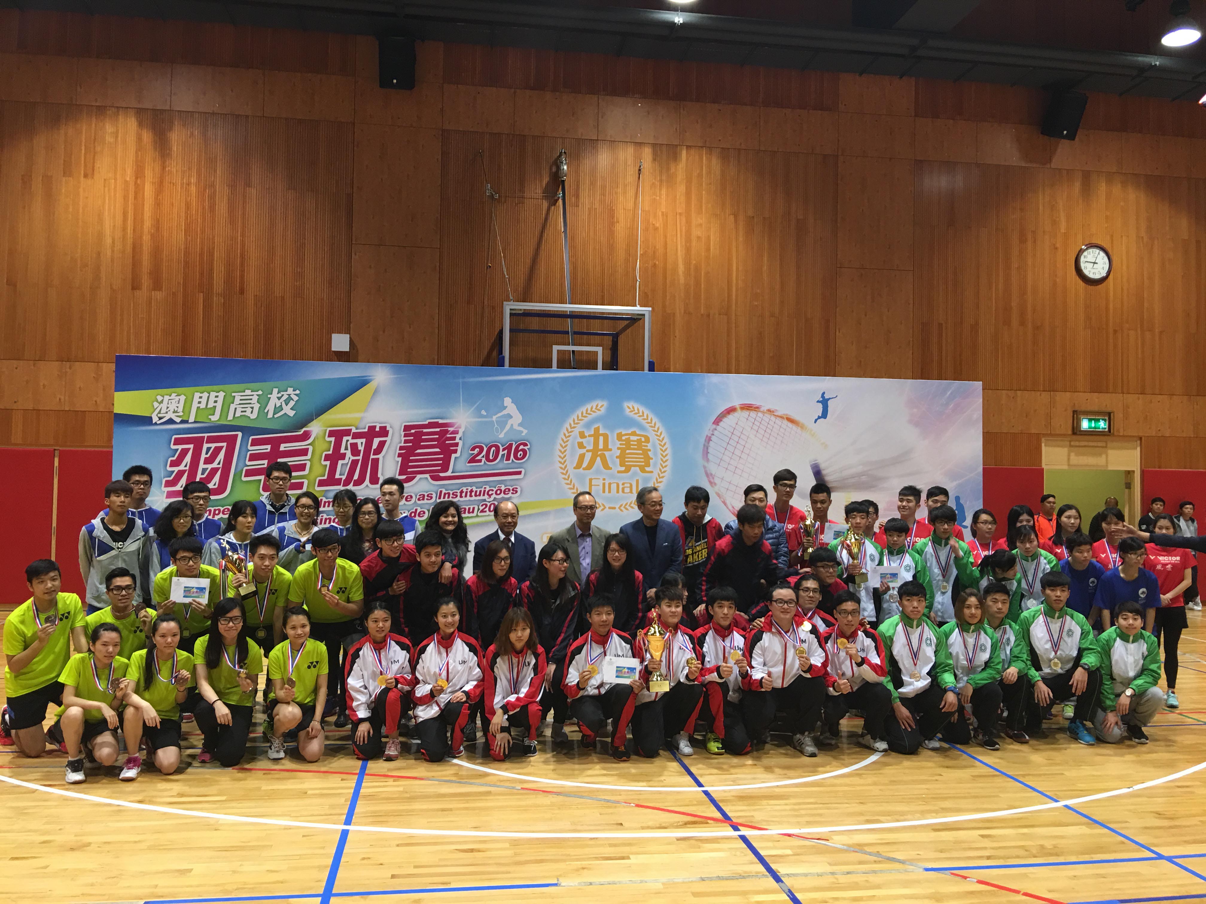 澳門大學羽毛球隊日前力壓澳門理工學院奪得首屆澳門高校羽毛球賽冠軍。今次賽事由高等教育輔助辦公室舉辦,吸引七所本地高等院校參加,包括澳門大學、澳門科技大學、聖若瑟大學、澳門城市大學、澳門理工學院、澳門鏡湖護理學院和旅遊學院。澳大副校長(學生事務)程海東教授也到場為學生打氣。