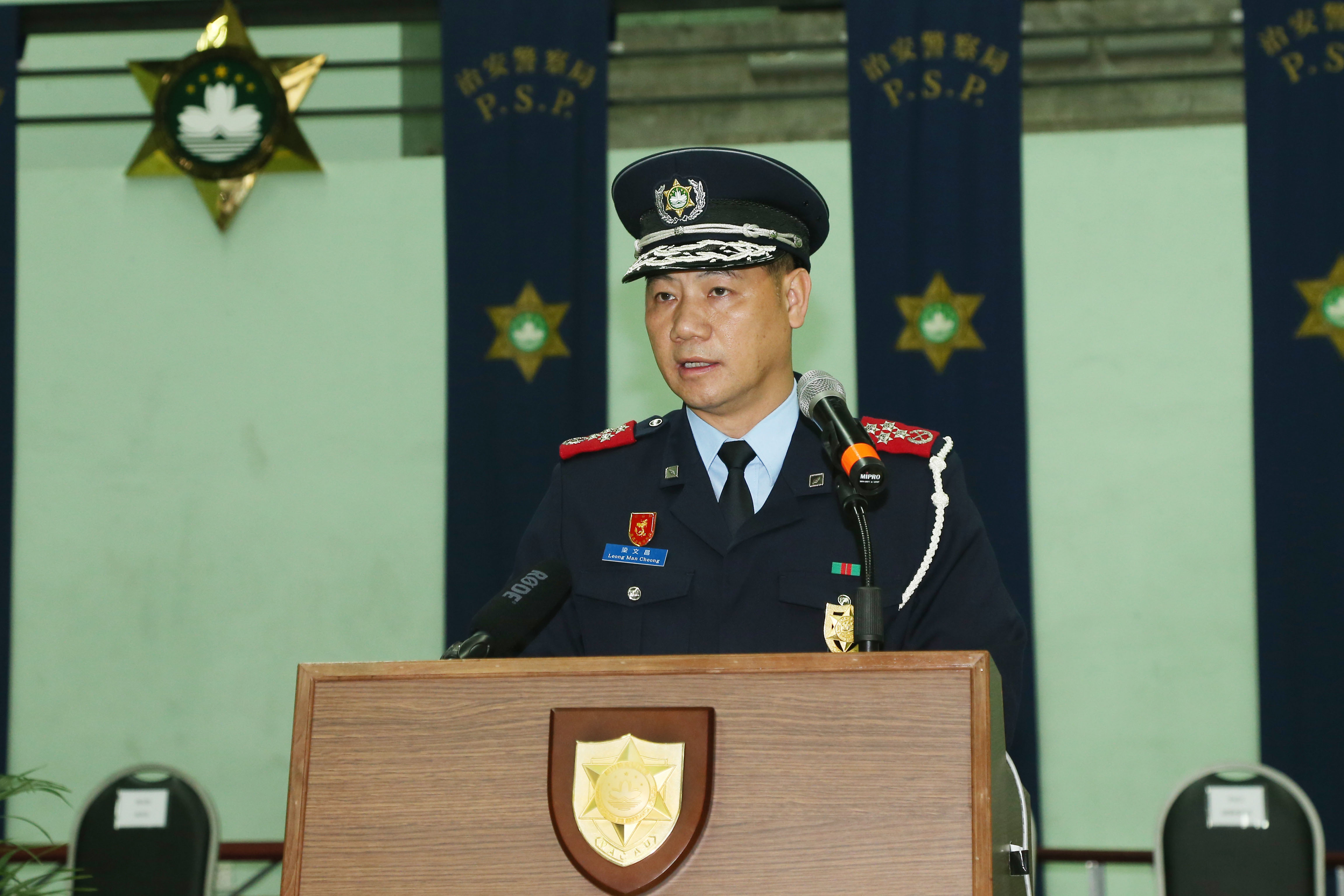 今天(4月15日)上午10時,在治安警察局特警總部室內運動場舉行了首席警員晉升儀式。儀式由治安警察局局長梁文昌警務總監、副局長吳錦華副警務總監及陳民德副警務總監主持。出席儀式的還有各部門的領導主管,為同僚晉升作出祝賀。