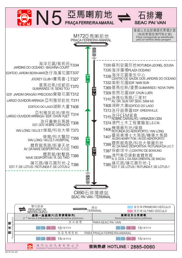 另一方面,於去年底開通的N5路線,考慮到啟運至今客量偏低,為發揮更大的營運效益,尤其服務氹仔其他住宅區域,同日調整該路線行程行經路氹城、湖畔大廈、氹仔市區、海洋花園及亞馬喇前地,以擴大夜間巴士路線的服務範圍,方便石排灣、氹仔市區及海洋花園居民夜間出行至亞馬喇前地、科大醫院及路氹城一帶,並調整有關路線的運作模式,由原來的循環路線改為雙向路線,維持15分鐘一班。