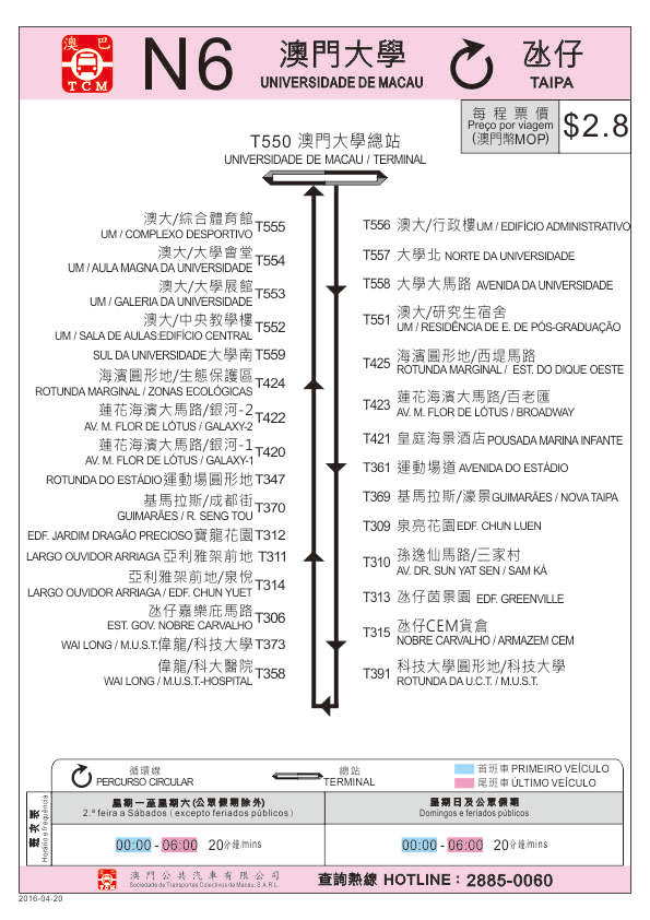 配合澳門大學學生及學校職員之出行需要,優化澳大橫琴校區的公交服務,交通事務局於本月20日(周三)凌晨零時起開通一條連接澳大橫琴校區至氹仔市中心的夜間巴士路線N6,有關路線將行經氹仔基馬拉斯大馬路、孫逸仙博士大馬路、偉龍馬路等主要幹道,為一循環路環。