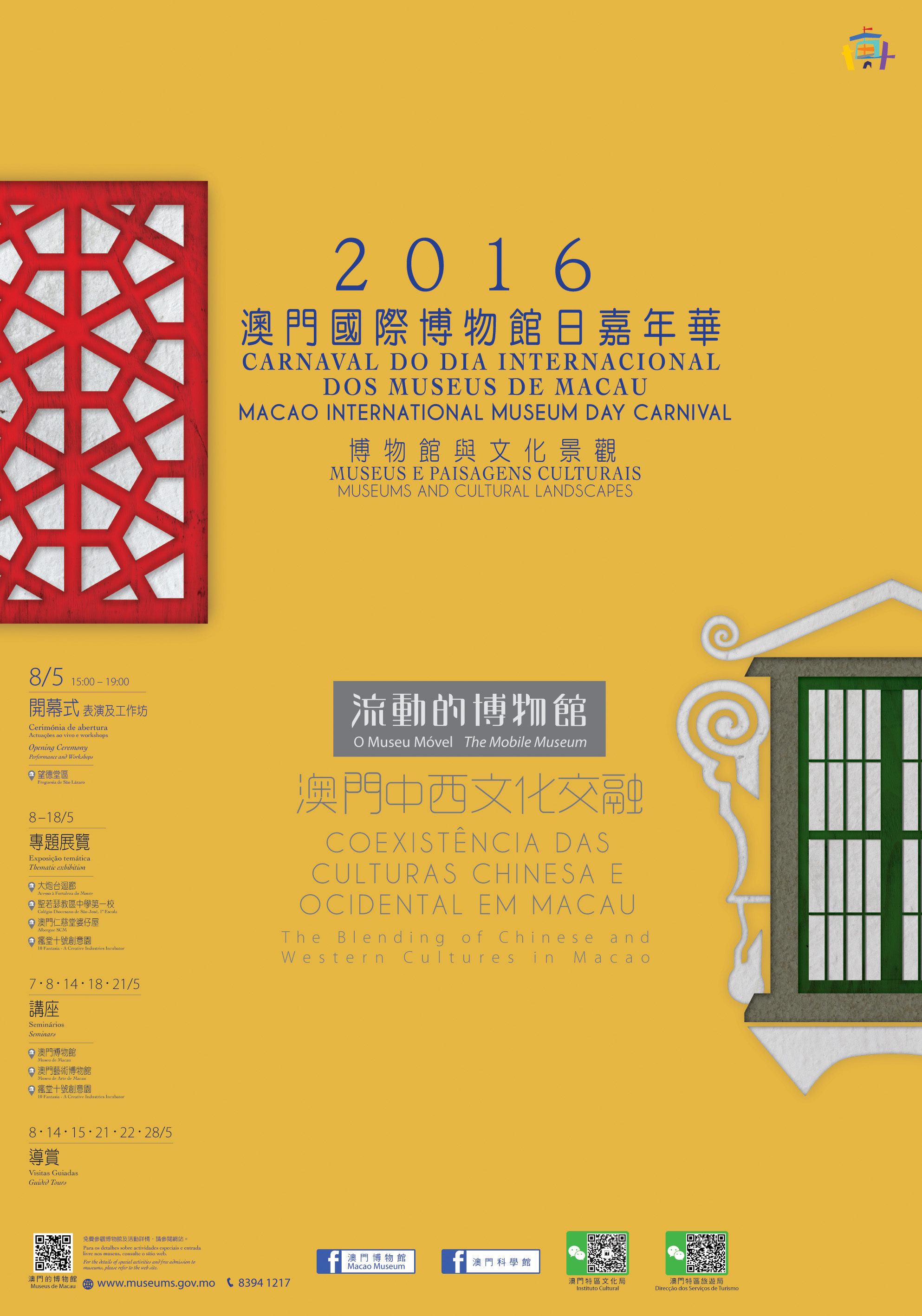 二零一六年國際博物館日大會主題為“博物館與文化景觀”。為響應此主題,向市民及遊客呈現澳門在中西方文化碰撞與交融下的獨特景觀,本屆“澳門國際博物館日嘉年華”以望德堂區為起點,連結周邊環境、歷史建築及文化氛圍,將此特色街區打造成“流動的博物館”,並於五月期間舉辦一系列精彩活動。當中結合宗教、建築、藝術、音樂、郵票、飲食和生活方式等中西文化交融元素,以專題展覽、工作坊、講座、導賞及街道嘉年華等形式呈現,向市民和遊客推廣澳門珍貴的博物館文化資源。