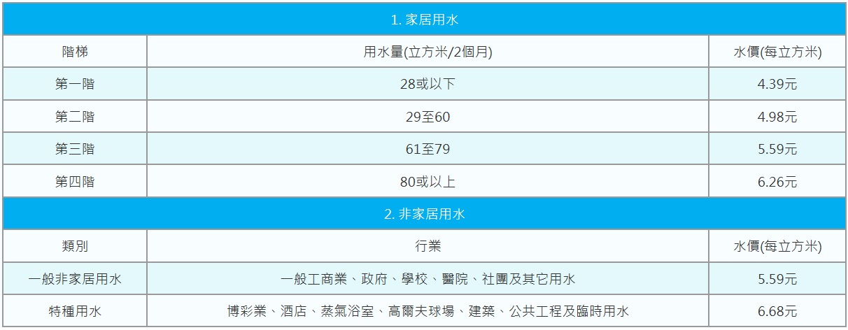 是次調整主要針對各類別水價,將不會改變水價機制的原有結構。在家居用水方面,為保障居民的基本用水,用水量較少的用戶,預計調升的幅度相對較為溫和,但各階梯之間的差距會拉大。一般非家居用水方面,由於其用水性質並非生活所需,調整時會綜合考慮供水成本的變化、消費物價指數和企業承受能力等因素。特種用水方面,相關企業有足夠的財政能力,因此將繼續支付全成本水價。