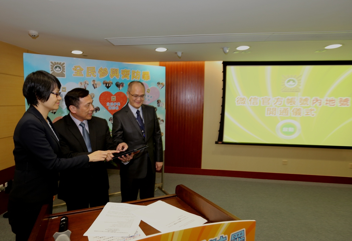 司法警察局舉行“全民參與齊防罪”啟動禮暨官方微信內地帳號開通儀式,冀鼓勵市民關愛家人及親友,將防罪資訊與身邊人分享,避免他們受到犯罪侵害;同時,為進一步向社會推廣防罪滅罪資訊,本局開通官方微信內地帳號,資訊將與海外號同步更新。