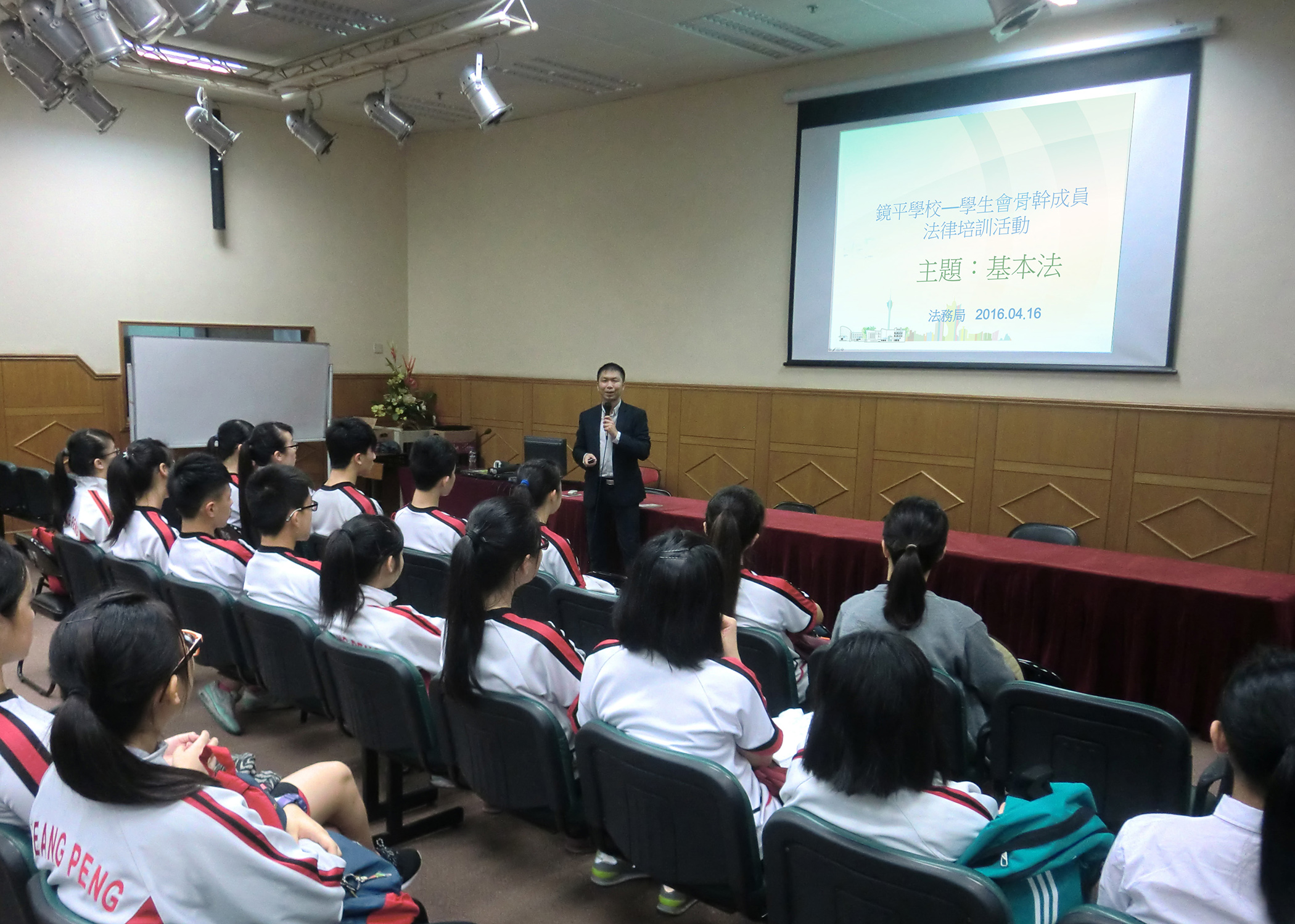 除了恆常的學校普法講座外,法務局今年亦應鏡平學校之邀,到該校舉行“學生會骨幹成員法律培訓講座”,以《基本法》及青少年相關法律為題,透過討論和互動環節,深化學生會骨幹成員的“愛國愛澳”教育,增加青少年對其切身相關法律的了解。