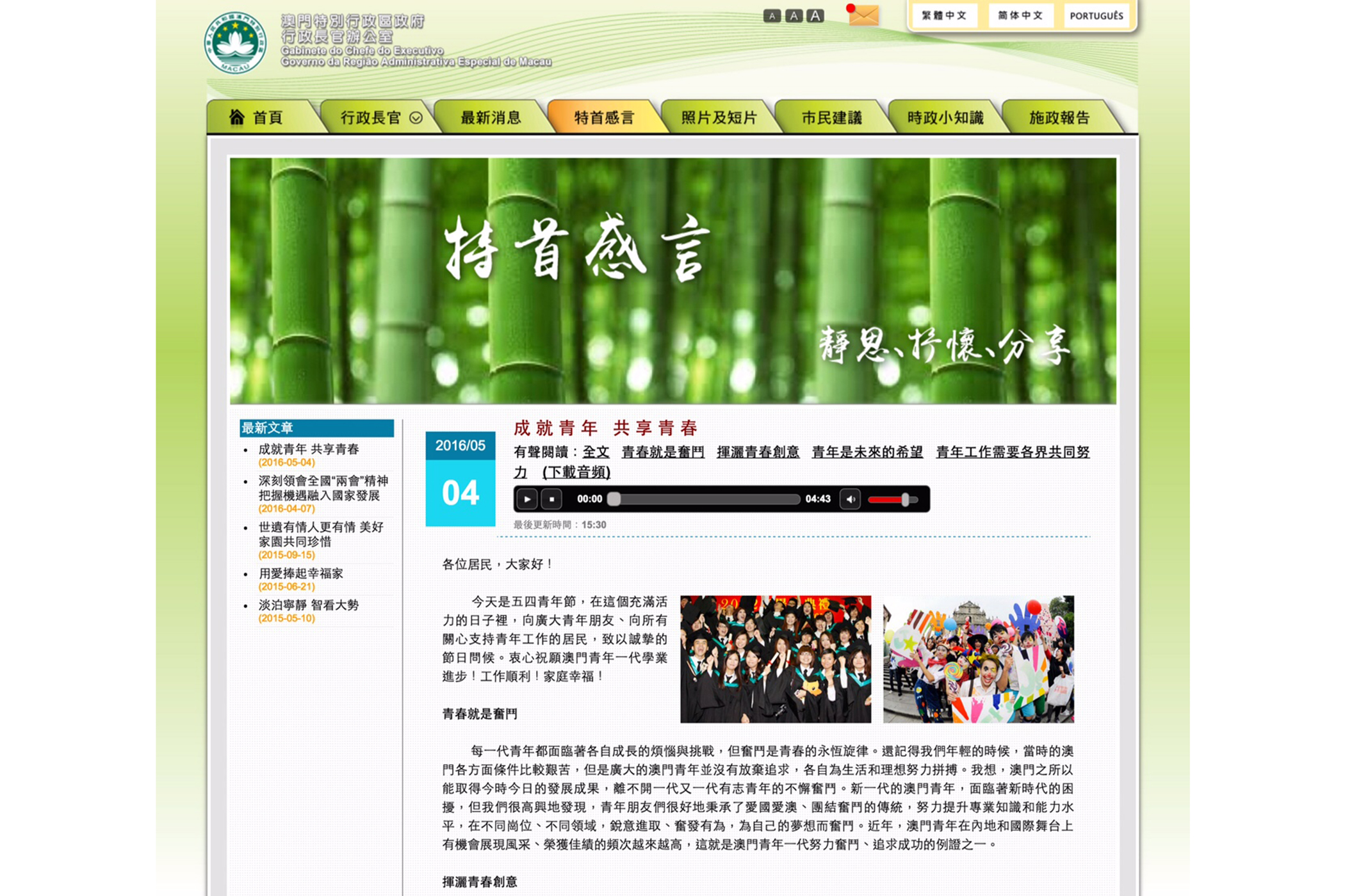 最新一篇“特首感言”的原聲錄音全文及分段,以及中、葡文字版本已上載於行政長官辦公室網站(www.gce.gov.mo),歡迎市民收聽及瀏覽。