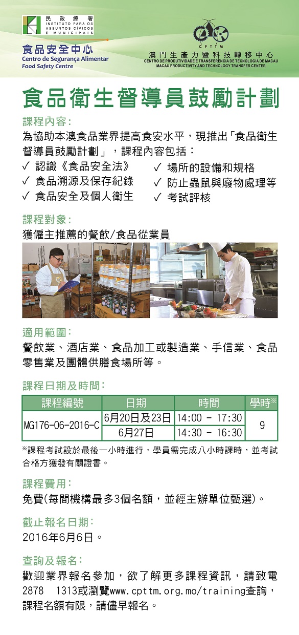 為協助本澳食品業界做好食品安全管理工作,民政總署委託澳門生產力暨科技轉移中心開辦“食品衛生督導員課程”,六月份課程將於六月二十日在澳門生產力暨科技轉移中心舉行。民署鼓勵僱主積極推薦員工報讀,為所屬公司及工作場所考取資格,提升從業人員的食安水平。截止報名日期為六月六日。