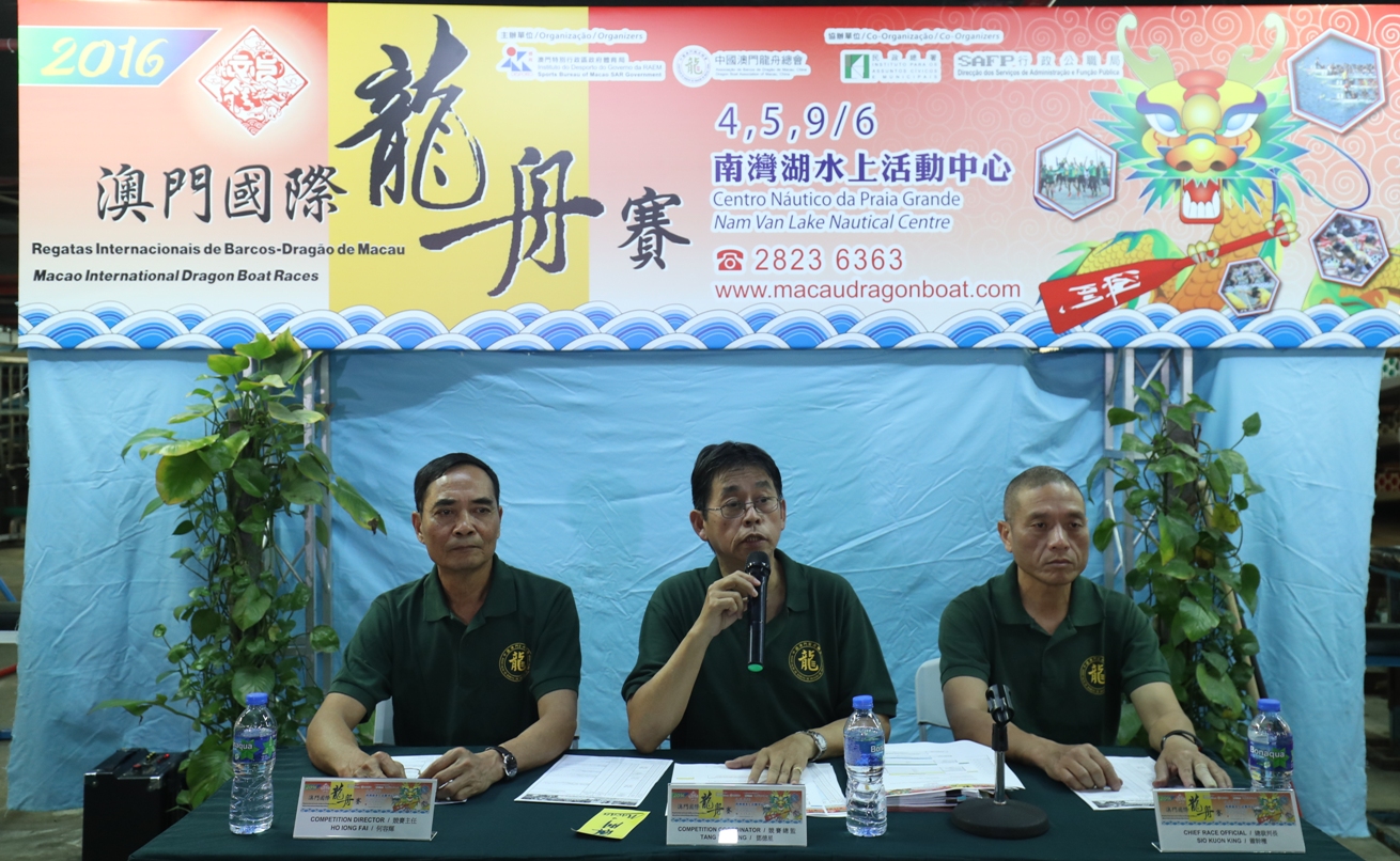 由體育局及中國澳門龍舟總會主辦,民政總署及行政公職局協辦的“2016澳門國際龍舟賽”,將於本年6月4日、5日及9日在南灣湖水上活動中心舉行。賽事組委會於今日(10日)在中國澳門龍舟總會辦事處舉行了抽籤儀式及技術會議。