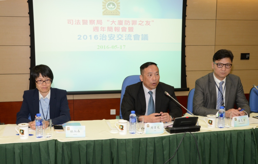 為加強警民合作,共同維護社區治安環境,司法警察局與多個社團及“司警局大廈防罪之友”會員進行治安交流會議,報告近期家居盜竊犯罪的情況,分析有關趨勢,以及探討如何吸納更多不同年齡層的人士加入“大廈防罪之友”,同時向過去一年積極參與司警局防罪宣傳活動的傑出會員頒發嘉許狀。