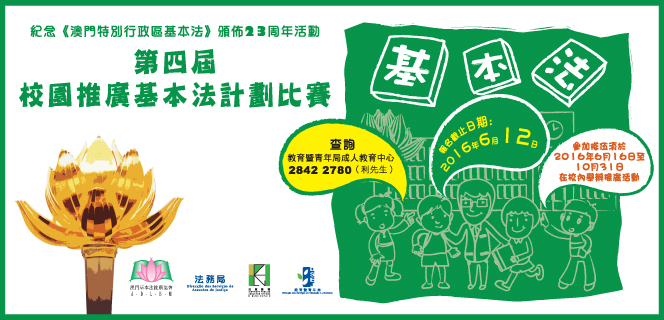 為鼓勵本澳中學生更了解《基本法》,法務局聯同澳門基本法推廣協會、民政總署及教育暨青年局合辦“第四屆校園推廣基本法計劃比賽”,透過師生共同構思,以及在校園內舉辦推廣《基本法》活動,加深學生對《基本法》的認識。