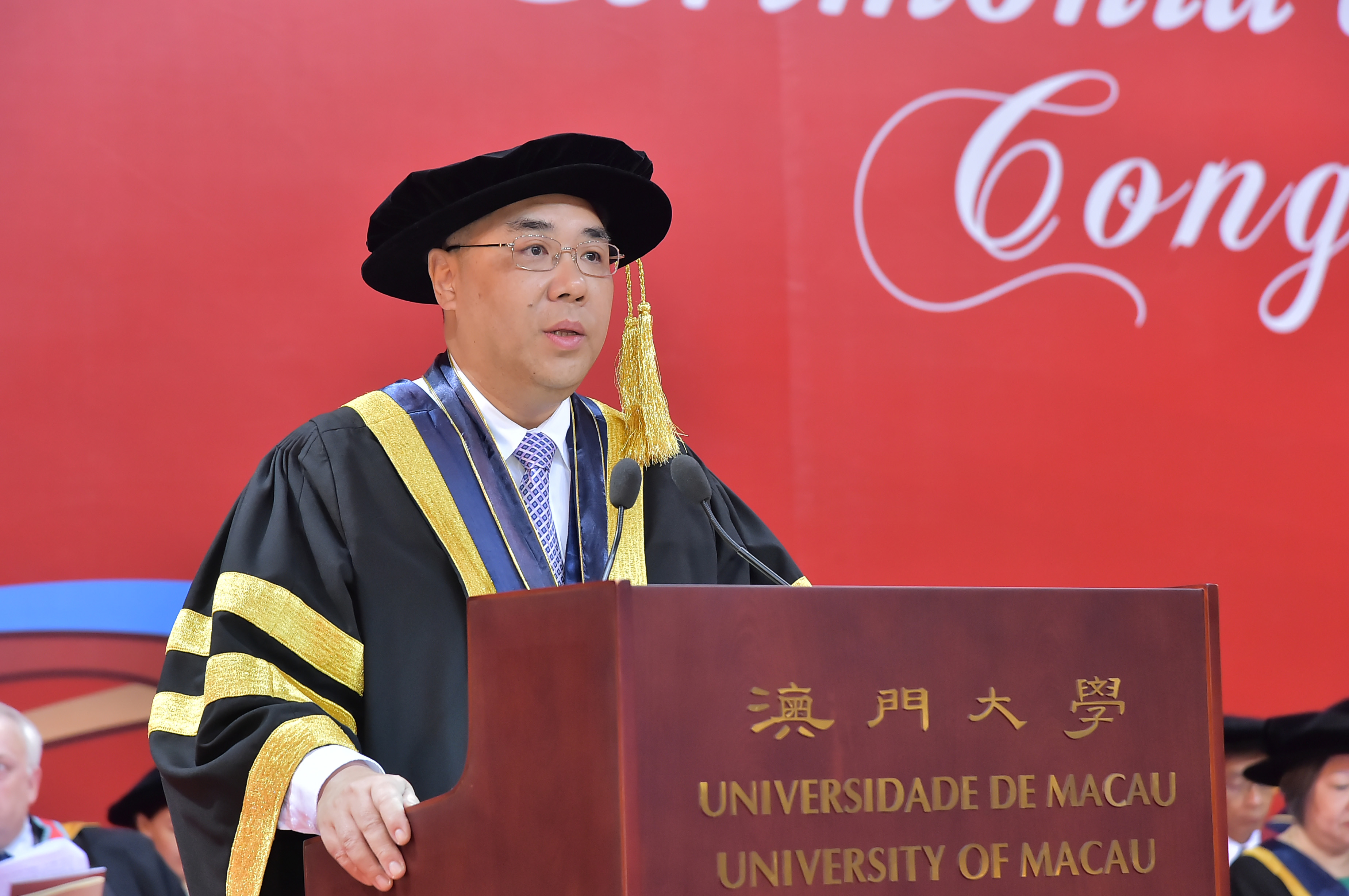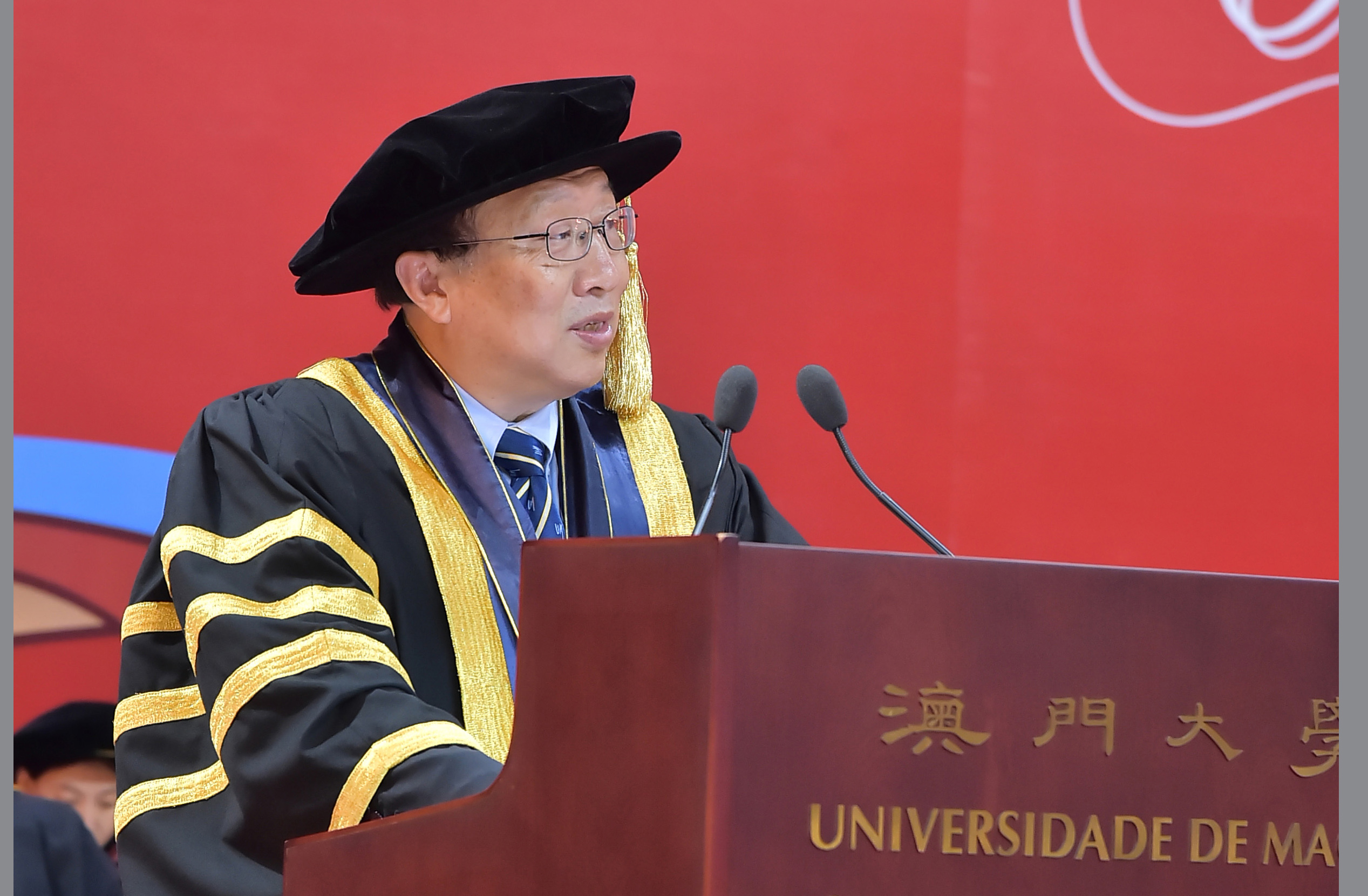 崔世安致辭時表示,澳大今年來更加注重學科建設,校園建設,管理制度建設和人才建設,改革課程體制,大學的教學、研究、管理進一步走上了發展的軌道,社會聲譽和學術影響得到了進一步的提升,同時,也為澳門社會輸送了更多優秀人才。他還指出,澳大已成為澳門高等人才培養的重要基地,相信處在快速發展關鍵時期的澳大,在建設“五個一流”的過程中,能夠應對各種各樣的挑戰,以積極進取的心態面對建設國際高水平大學過程中遇到的各種問題,從而在建設國際一流大學的艱巨歷程中能勇往直前。