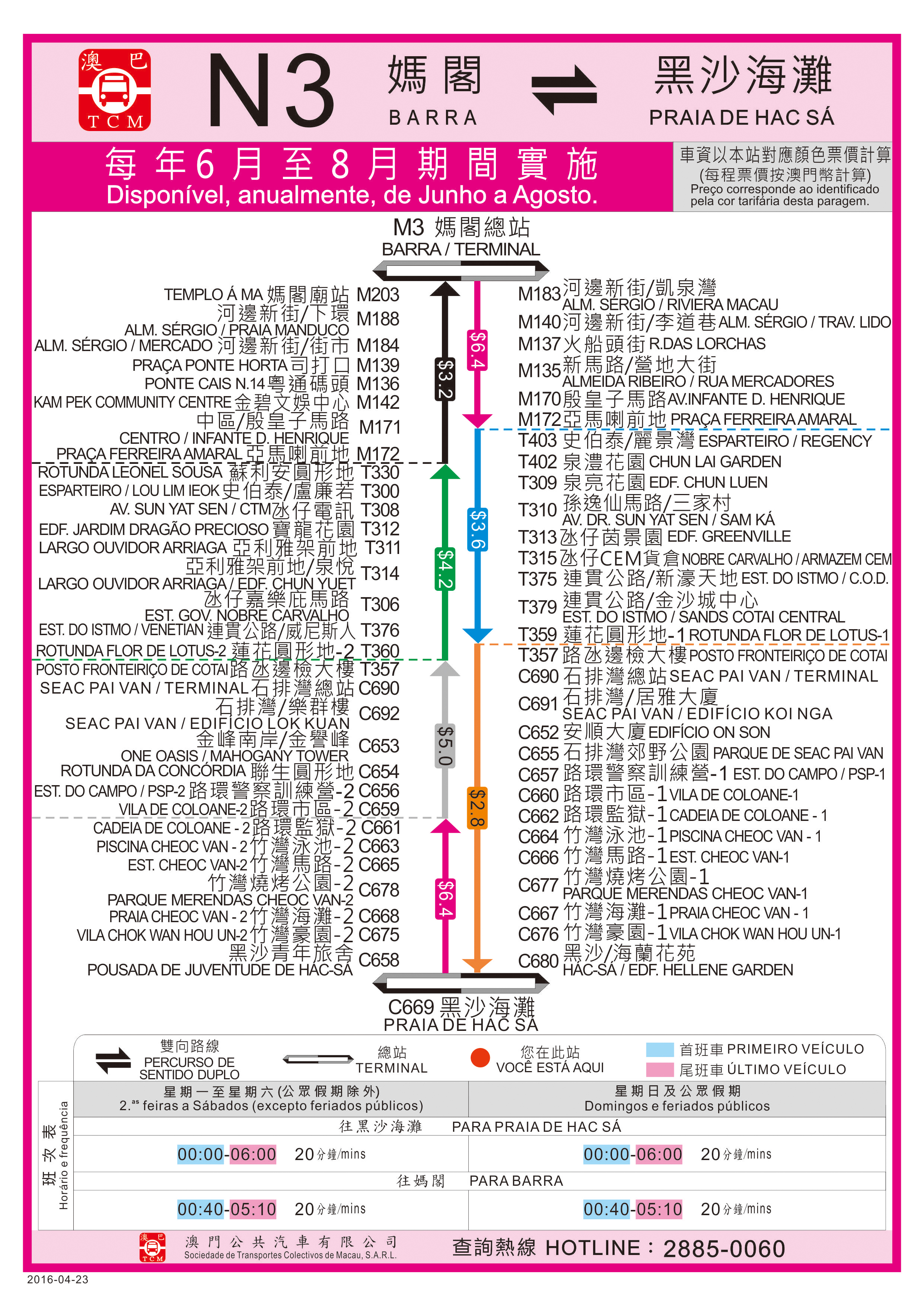 因應暑期將至,為方便市民大眾前往路環兩個海灘遊樂,N3路線6月1日至8月31日期間會延長服務行程。上述路線去程於“媽閣總站”出發,按原線行駛至路環市區後,新增停靠“路環監獄-1”、“竹灣泳池-1”、“竹灣馬路-1”、“竹灣燒烤公園-1”、“竹灣海灘-1”、“竹灣豪園-1”、“黑沙/海蘭花苑”及“黑沙海灘”巴士站;回程則由“黑沙海灘”站開出,停靠“黑沙青年旅舍”、“竹灣豪園-2、“竹灣海灘-2” 、“竹灣燒烤公園-2”、“竹灣馬路-2”、“竹灣泳池-2”及“路環監獄-2”站後,按原線行駛返回“媽閣總站”。有關路線的服務時間為晚上12時至清晨6時,班次為20分鐘一班。