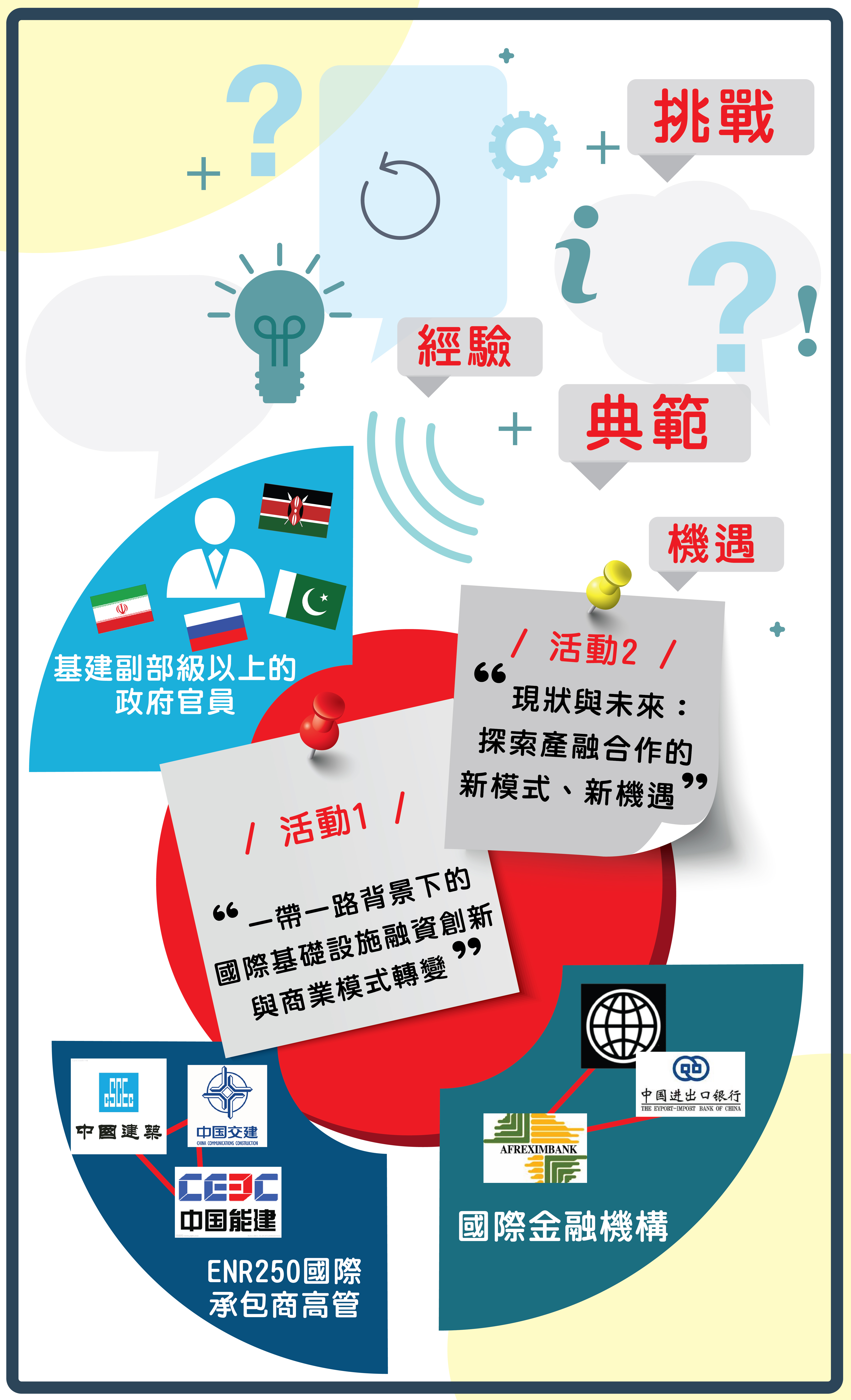 第七屆高峰論壇將從項目所在國主管部門、國際金融機構和承包商的視角,重點探討“一帶一路”建設、全球區域經濟一體化下產融創新合作為基礎設施投資建設帶來的發展機遇。通過舉辦“現狀與未來:探索產融合作的新模式、新機遇”和“一帶一路背景下的國際基礎設施融資創新與商業模式轉變”兩場活動,邀請俄羅斯、伊朗、巴基斯坦、肯雅等國家的基建副部級以上政府官員,以及世界銀行、中國進出口銀行、非洲進出口銀行等國際金融機構與中國建築、中國交建、中國能建等ENR250國際承包商高管對創新產融合作新模式、各國產融合作實踐的經驗和典範、創新產融合作為國際基建合作帶來的機遇與挑戰等問題發表獨到的見解和觀點。