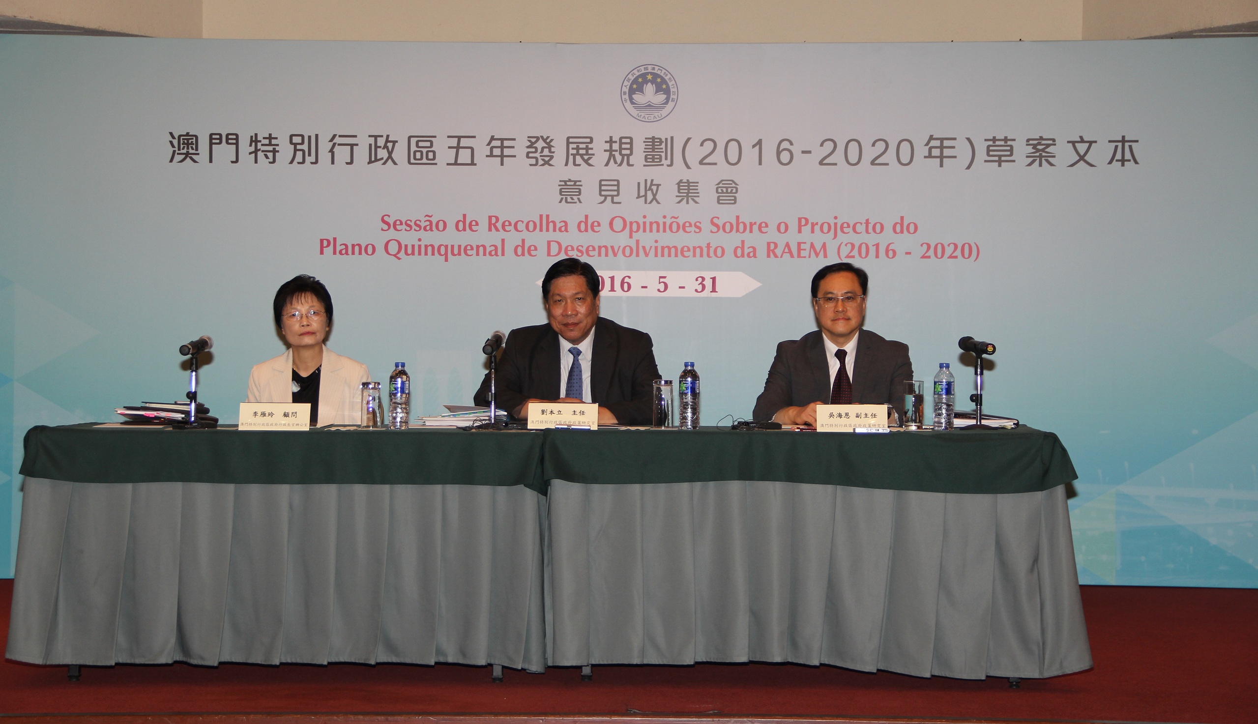 《澳門特別行政區五年發展規劃(2016-2020年)草案文本》於4月26日公佈並展開為期兩個月的意見收集工作。專責本次工作的政策研究室今日(5月31日)於澳門世界貿易中心蓮花廳舉行了兩場社會文化範疇及直屬行政長官的諮詢組織專場意見收集會。政策研究室主任劉本立、行政長官辦公室顧問李雁玲及政策研究室副主任吳海恩出席了意見收集會,並聽取了與會人士的意見。