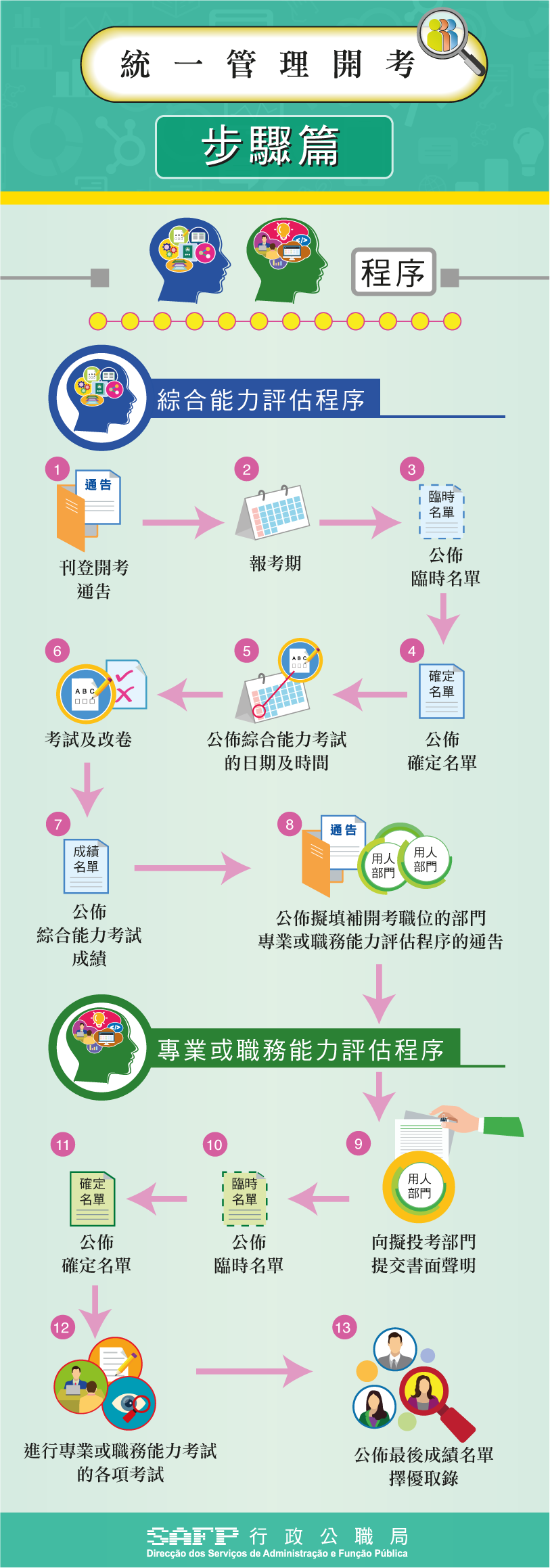 統一招聘分為“綜合能力考試”,以及“專業或職務能力考試”,適用對象包括第14/2009號法律《公務人員職程制度》規範的職程,涵蓋14個一般職程及20個特別職程,計劃於今年內就高級技術員、技術輔助人員及工人這三個人員組別舉辦“綜合能力考試”。
