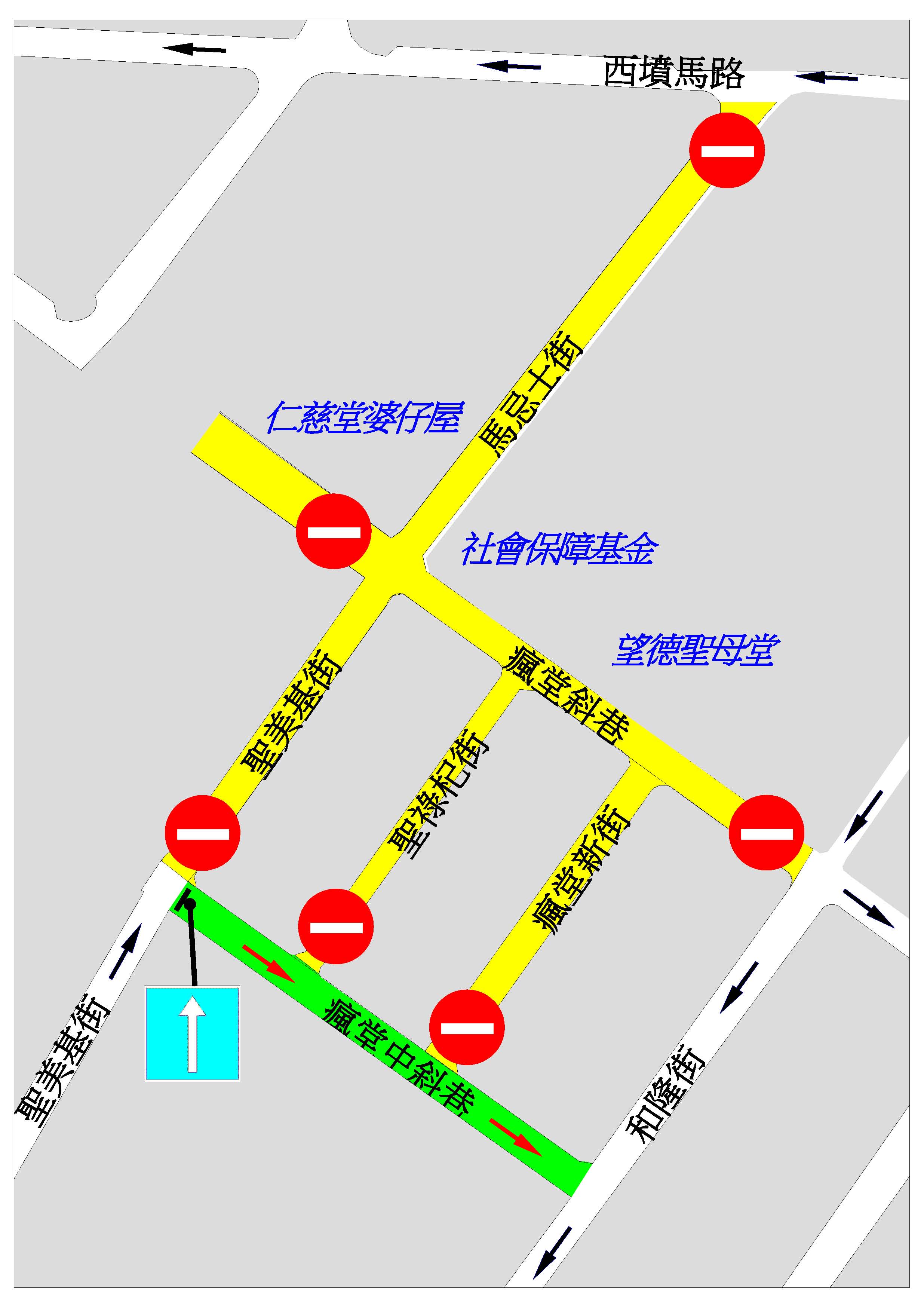 因應活動舉行,本月24日(周五)晚上9時至27日(周一)上午6時,瘋堂斜巷、聖美基街、聖祿杞街、瘋堂新街及馬忌士街實施封閉交通,同時,介乎聖美基街與和隆街之間的一段瘋堂中斜巷則改為反方向行車,即車輛可由聖美基街往和隆街方向行駛。配合活動需要,本月24日(周五)上午9時起,瘋堂中斜巷、馬忌士街、聖美基街和瘋堂新街之咪錶及電單車泊車位會陸續暫停使用,直至活動結束。