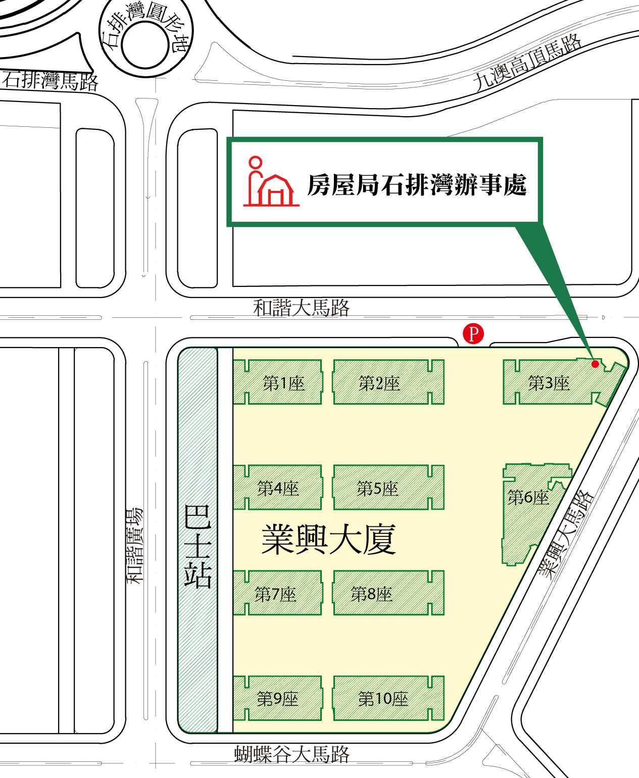房屋局石排灣辦事處位於業興大廈第三座地舖,由今(1日)起調整辦公時間為週一至週四(10:00-13:00、14:30-18:45),週五(10:00-13:00、14:30-18:30),公眾假期除外。