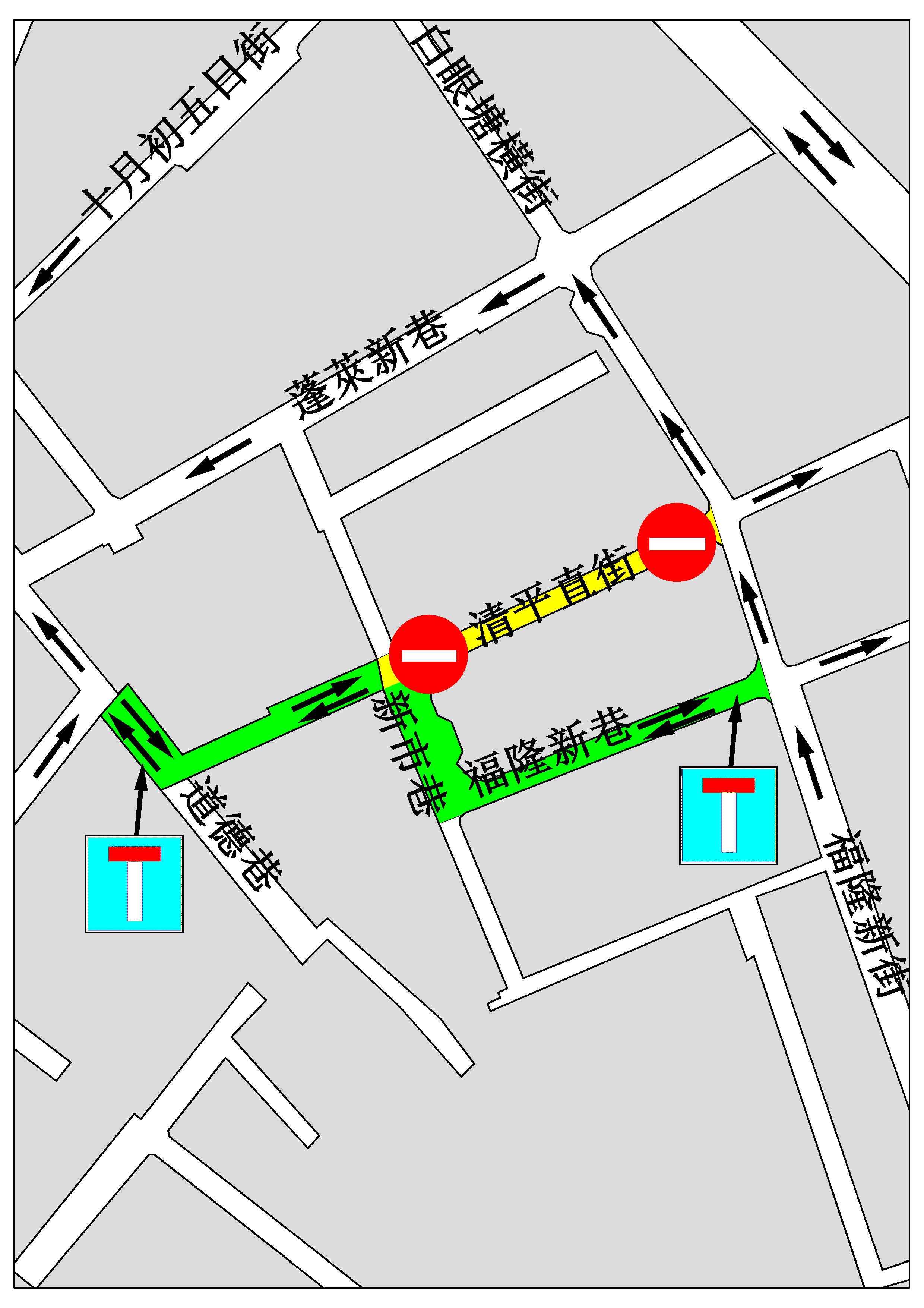 福隆新街一帶電纜鋪設持續推進,配合第二階段施工,本月11日(周一)至25日(周一),介乎福隆新街與新市巷之間的一段清平直街封閉交通(周日除外);介乎福隆新街與清平直街之間的一段福隆新巷及新市巷,以及介乎蓬萊新街與新市巷之間的一段道德巷及清平直街改為無出口道路;新市巷的電單車泊車位及上落客貨區暫停使用,為期約20日。
