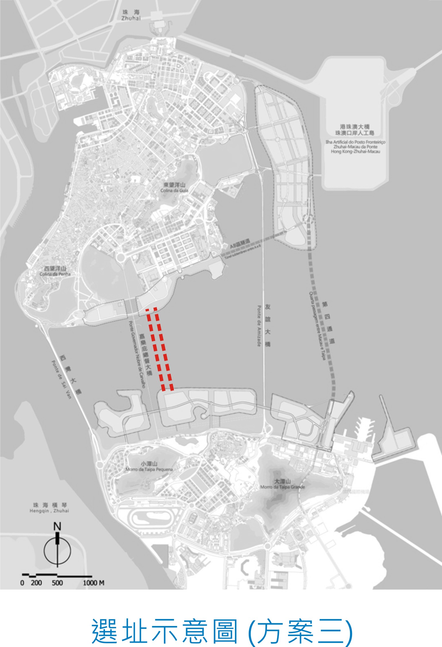 考慮到該處是澳門半島與氹仔之間的海面距離最短的地方,以及避免影響嘉樂庇總督大橋及周邊區域的景觀,土地工務運輸局經初步研究後,認為適宜在嘉樂庇總督大橋旁以隧道形式興建跨海通道,以連接新城填海C、D區(氹仔)及新城填海B區(澳門)。每條隧道初步估計全長約1,200米(即嘉樂庇總督大橋總長度一半)、最少兩線單向行車道,其中一條隧道向澳門半島方向,另一條向氹仔方向。選址包括三個方案,即大橋兩邊各建一條隧道管道、大橋西邊建兩條隧道管道或大橋東邊建兩條隧道管道。