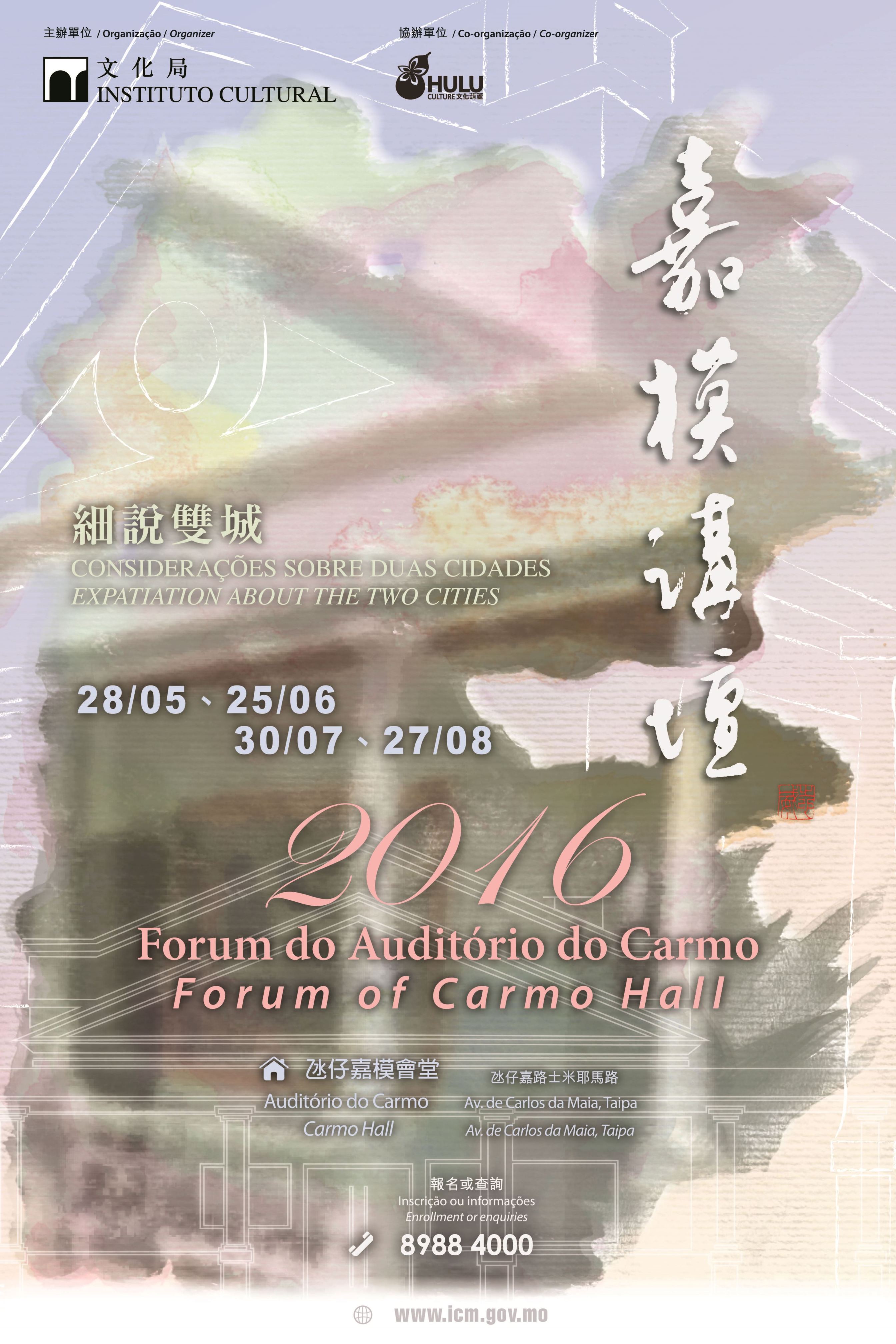 由文化局主辦、文化葫蘆協辦的二零一六年“嘉模講壇──細說雙城”將於七月三十日(星期六)在氹仔嘉模會堂舉行,設有兩場講座,分別為“戲橋”及“香港建築保育”。費用全免,名額有限,先到先得,歡迎有興趣人士報名參加。