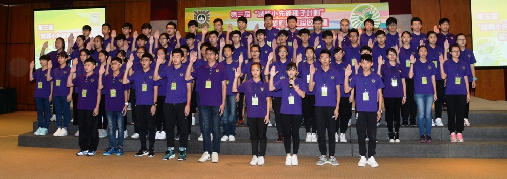 第三屆“滅罪小先鋒種子計劃”共有79位學員順利完成課程並達標,獲頒發結業證書,其中10位表現優秀的學員更獲嘉許,同時獲委任為小隊長,協助帶領新一屆的學員接受培訓。另外,8位第二屆“滅罪小先鋒”小隊長及5位第一屆“滅罪小先鋒”學員,積極協助帶領第三屆學員進行培訓,以及參與司警局舉辦的防罪宣傳活動,分別獲頒授優秀領袖獎狀和傑出表現獎狀。隨後,105位參加第四屆“滅罪小先鋒種子計劃”的學員在代表帶領下進行宣誓和新舊學員傳承儀式。