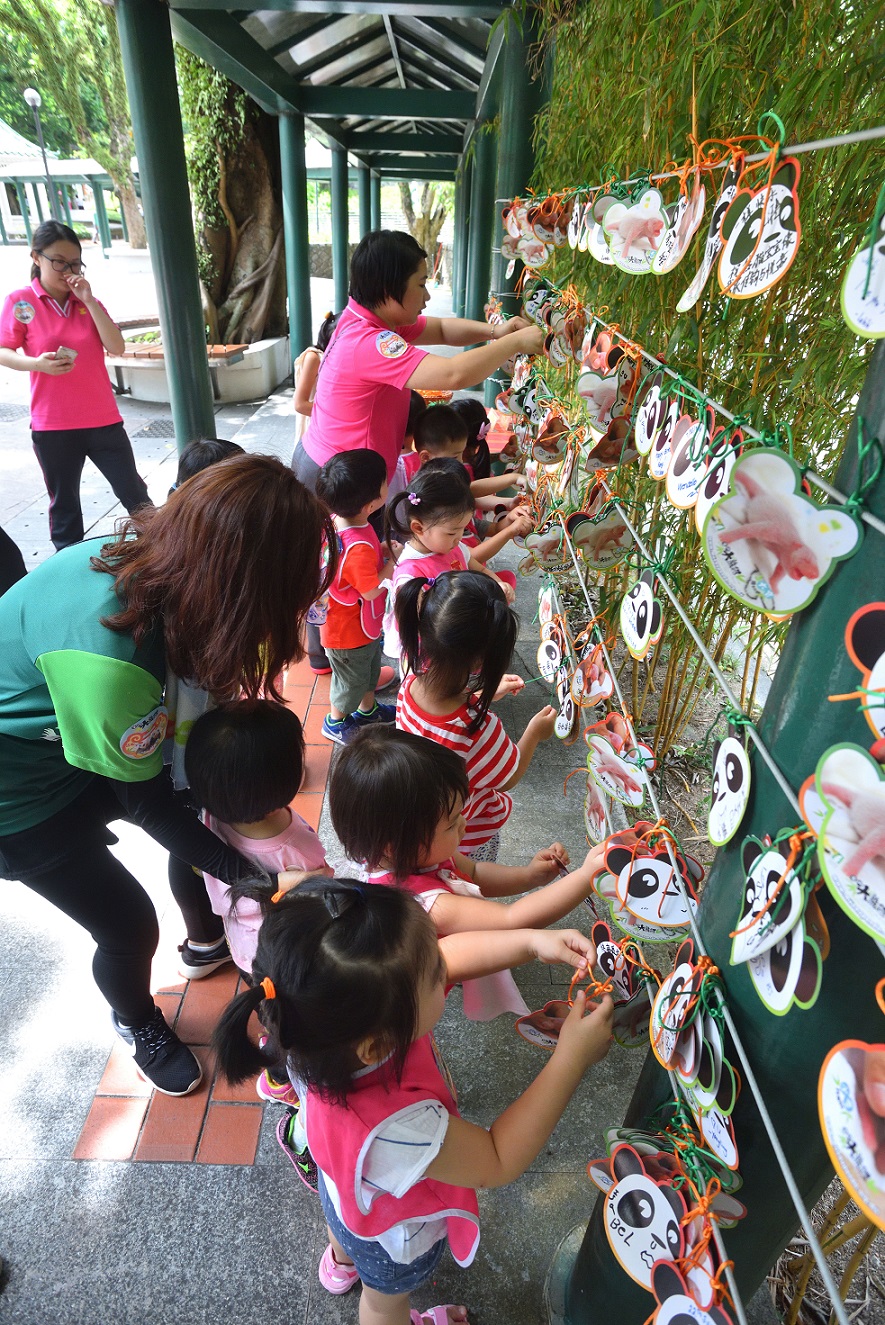 為了慶祝“大寶”“小寶”滿月這個喜慶的日子,民署特別邀請三十多名就讀托兒所的小朋友,到石排灣郊野公園為 “大寶"“小寶"進行滿月慶祝活動,包括由小朋友書寫心意卡掛在許願牆上以表達祝福,參觀澳門大熊貓館探望大熊貓爸爸“開開",以及分批到後勤地區透過特設的觀察窗近距離觀看“大寶"“小寶"的生活狀況,一同見證及分享大熊貓寶寶滿月的喜悅。